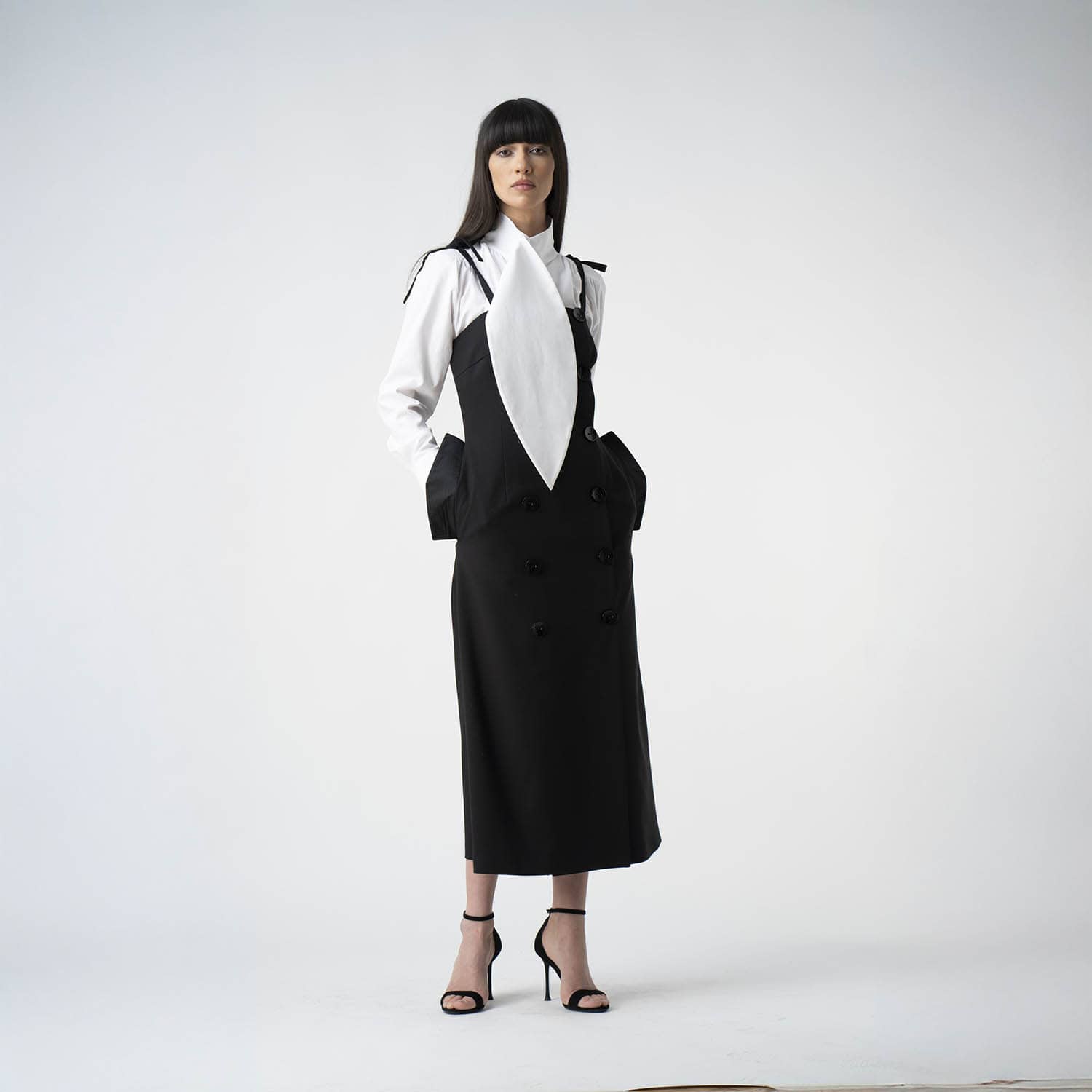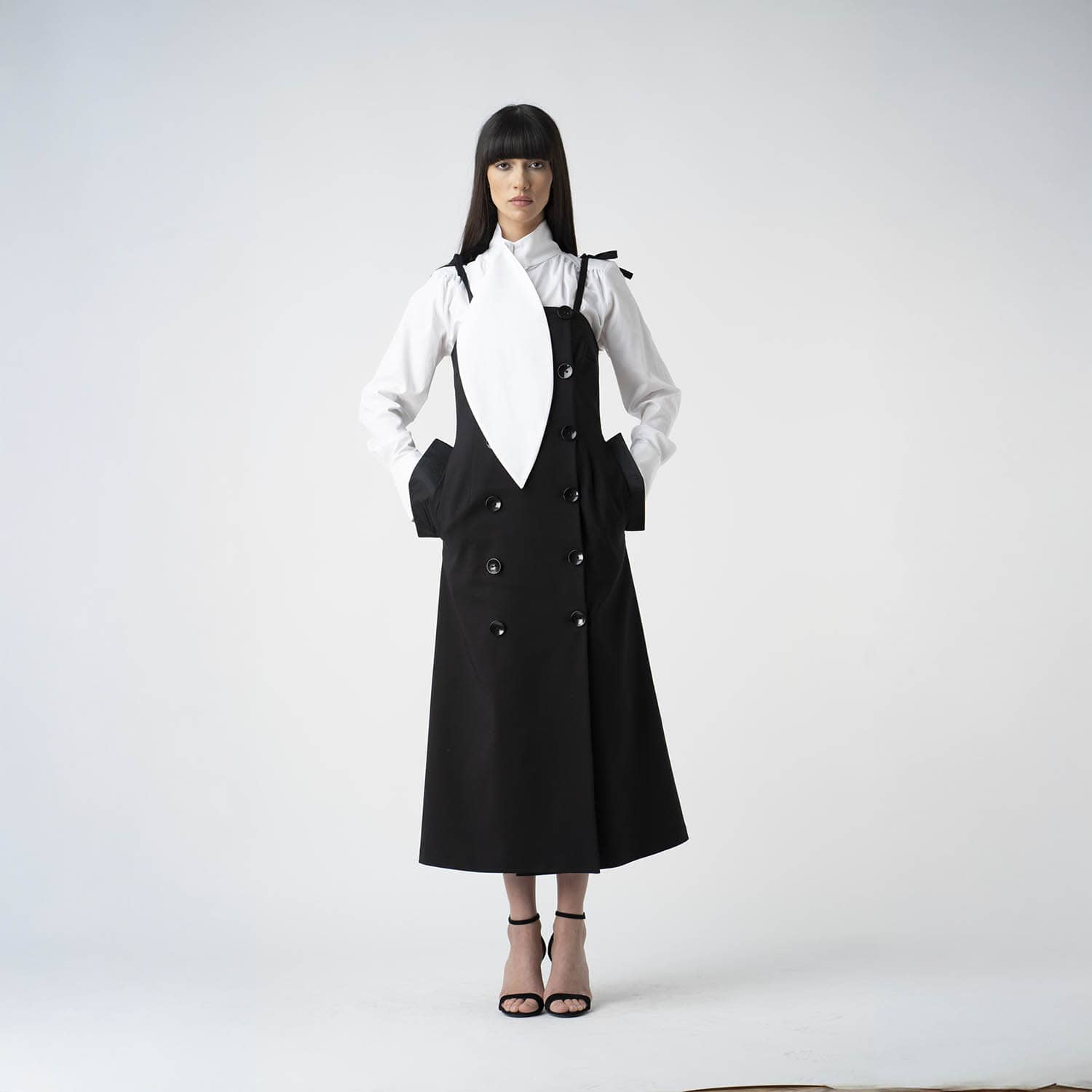 Urban elegance in a refined form: this midi sundress with a structured cut and decorative button closure is versatile and sophisticated. The design with thin straps and functional pockets adds utility to a silhouette with classic influences. It is an ideal piece for combinations with statement shirts or fluid tops.