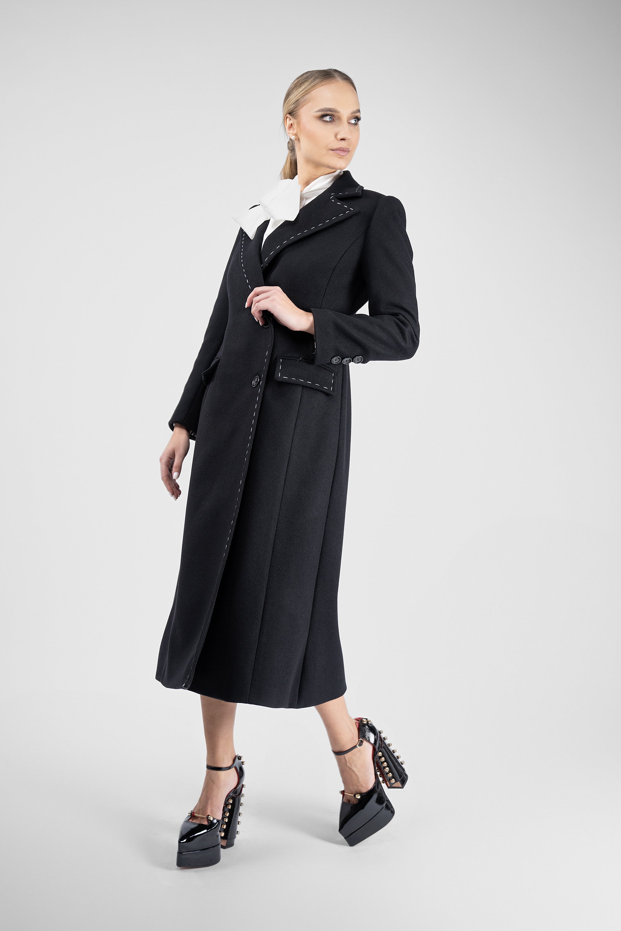 Palton elegant realizat din lana premium, accentuat cu cusaturi manuale in contrast. Designul cambrat si liniile bine conturate pun in valoare silueta, iar detaliile decorative adauga un aer sofisticat si rafinat. O piesa atemporala, esentiala in garderoba feminina.