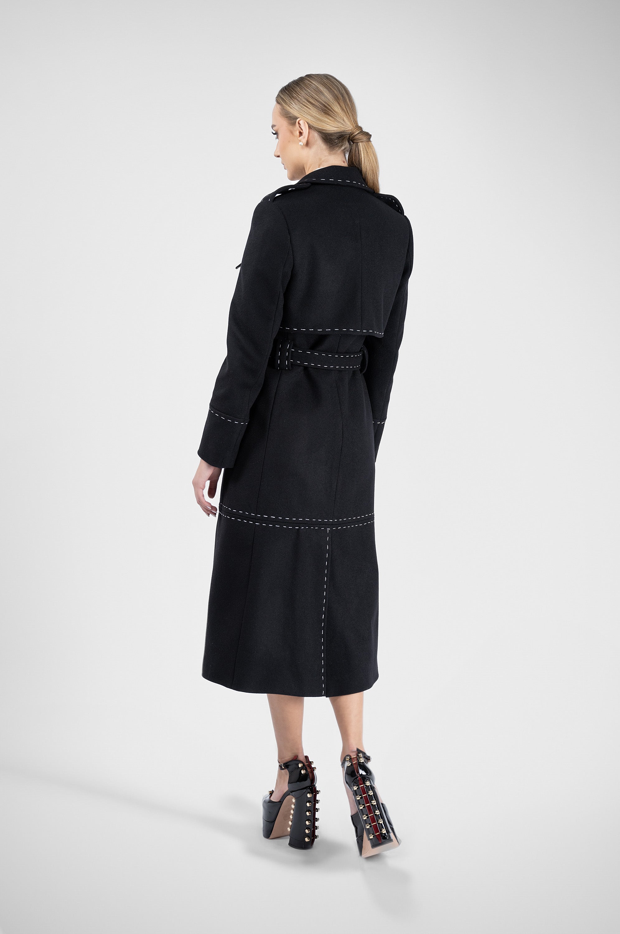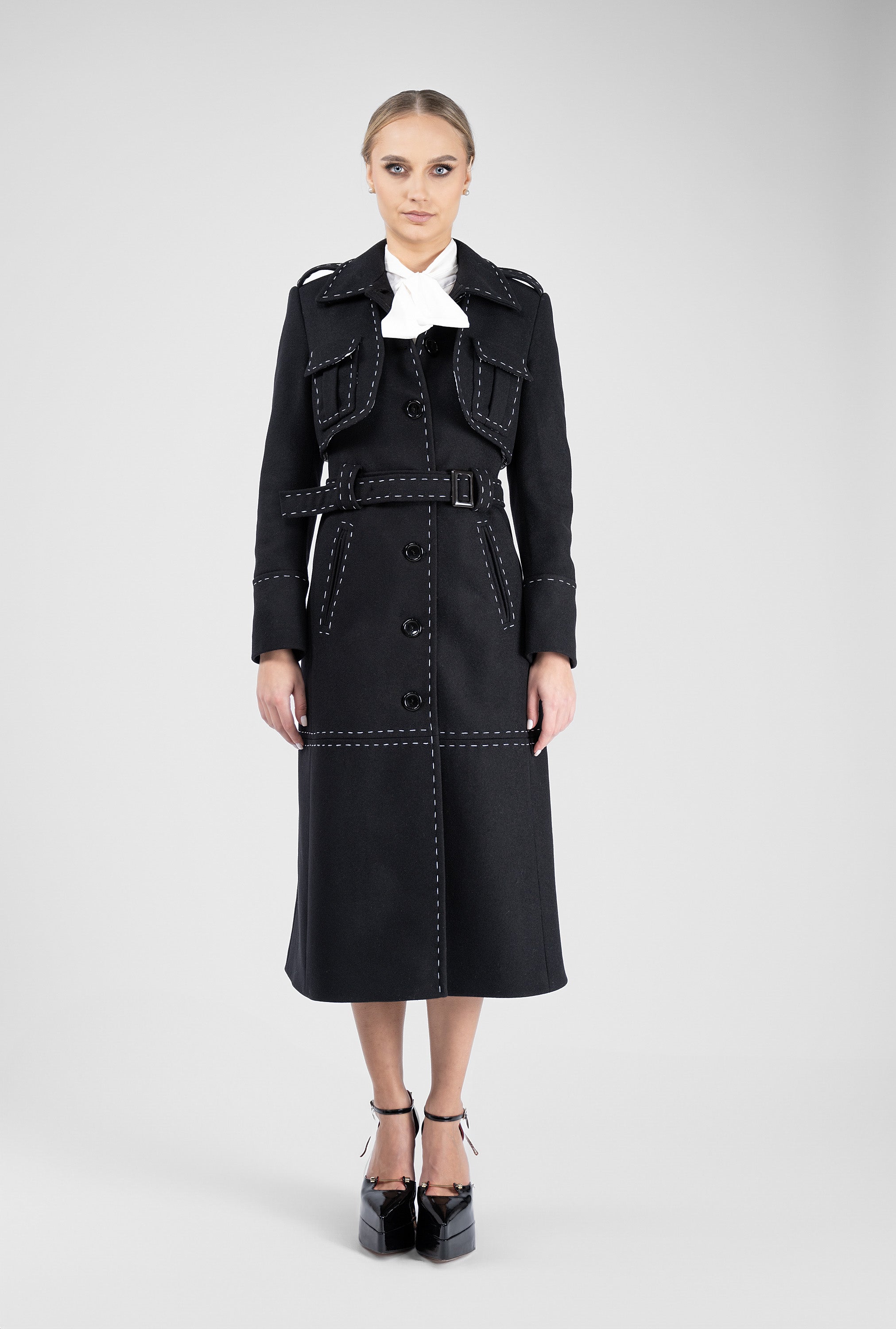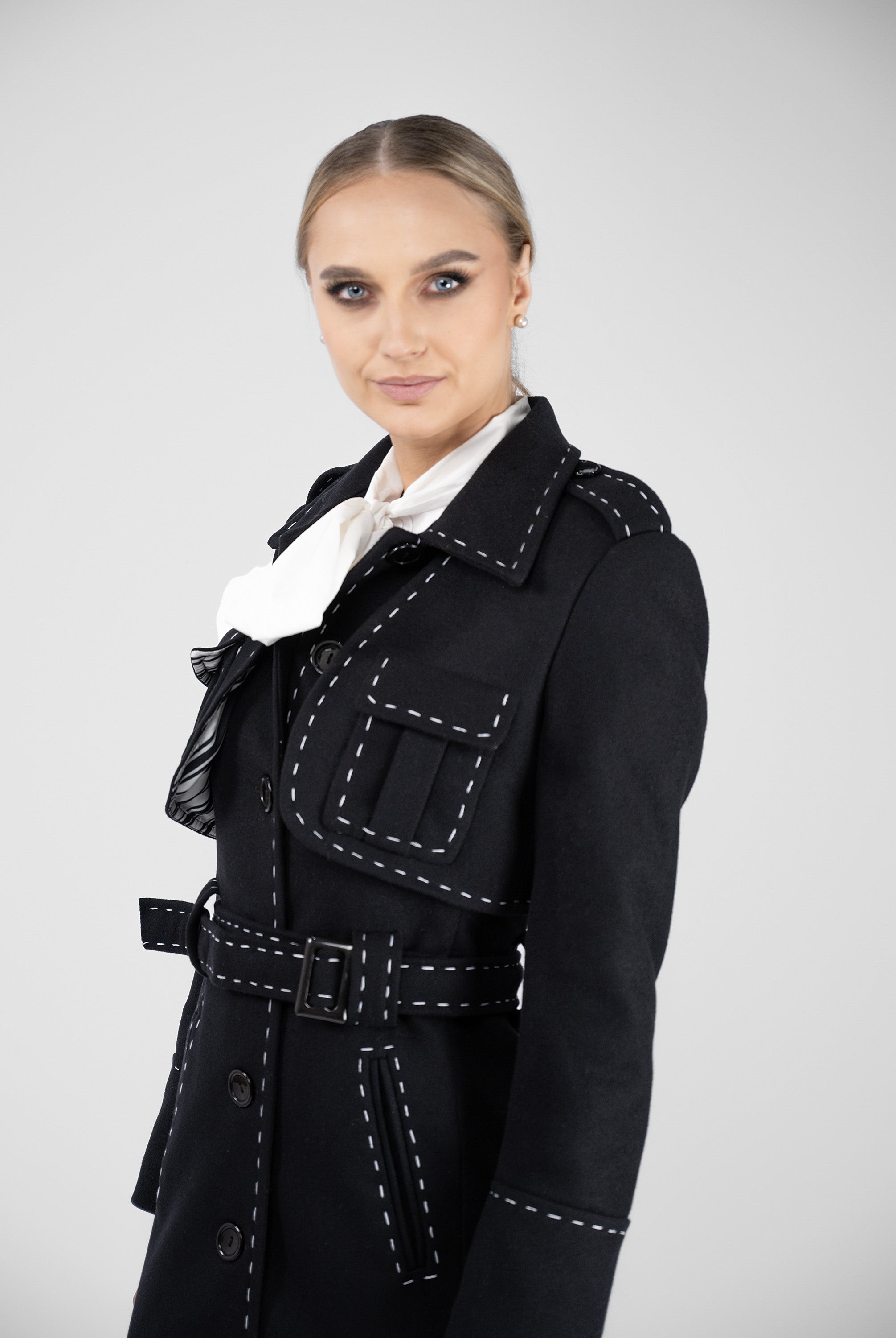 O piesa statement ce imbina maiestria artizanala cu eleganta clasica, acest palton din lana se remarca prin cusaturile manuale in contrast, care contureaza silueta si adauga un aer couture. Detaliile de inspiratie militara – epoletii, buzunarele frontale supradimensionate si cureaua in talie – ofera un plus de personalitate. Un palton care transforma orice tinuta intr-o aparitie sofisticata si rafinata.