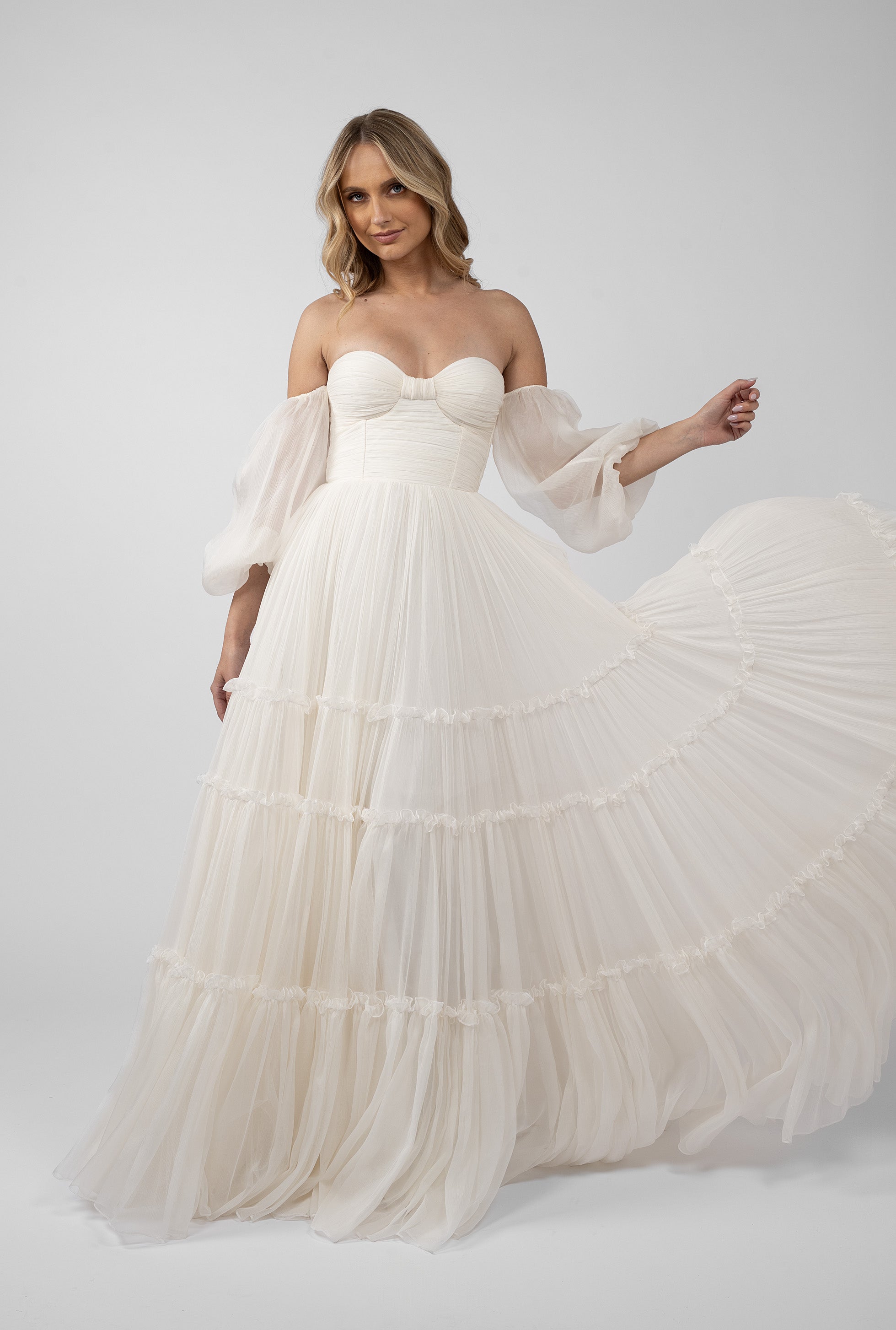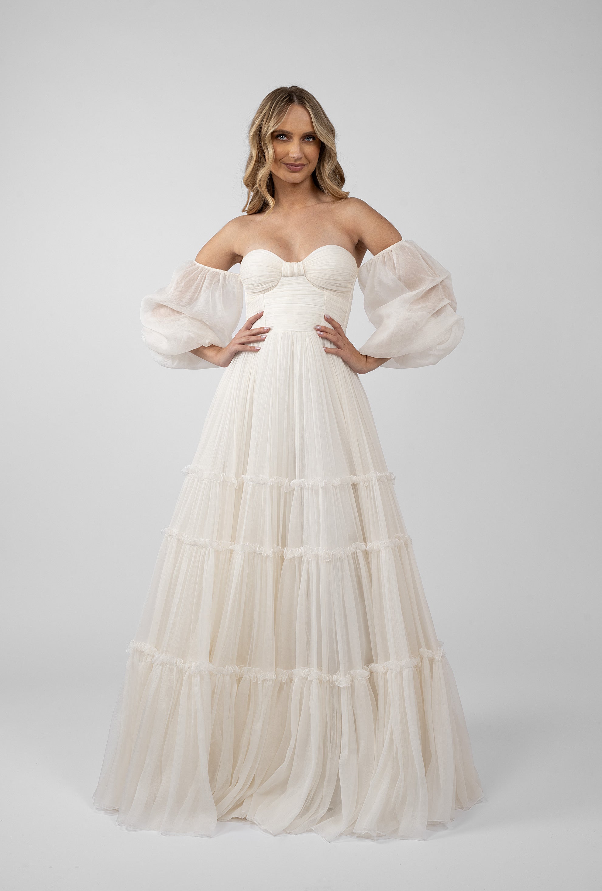 O rochie ce impresioneaza prin fluiditatea spectaculoasa a voalului de matase si prin aerul romantic al detaliilor. Bustul tip corset evidentiaza silueta intr-un mod delicat, in timp ce manecile bufante cazute adauga un plus de feminitate. Fusta ampla, construita in straturi vaporoase, se deschide in volane fine, creand un efect diafan si memorabil la fiecare pas.