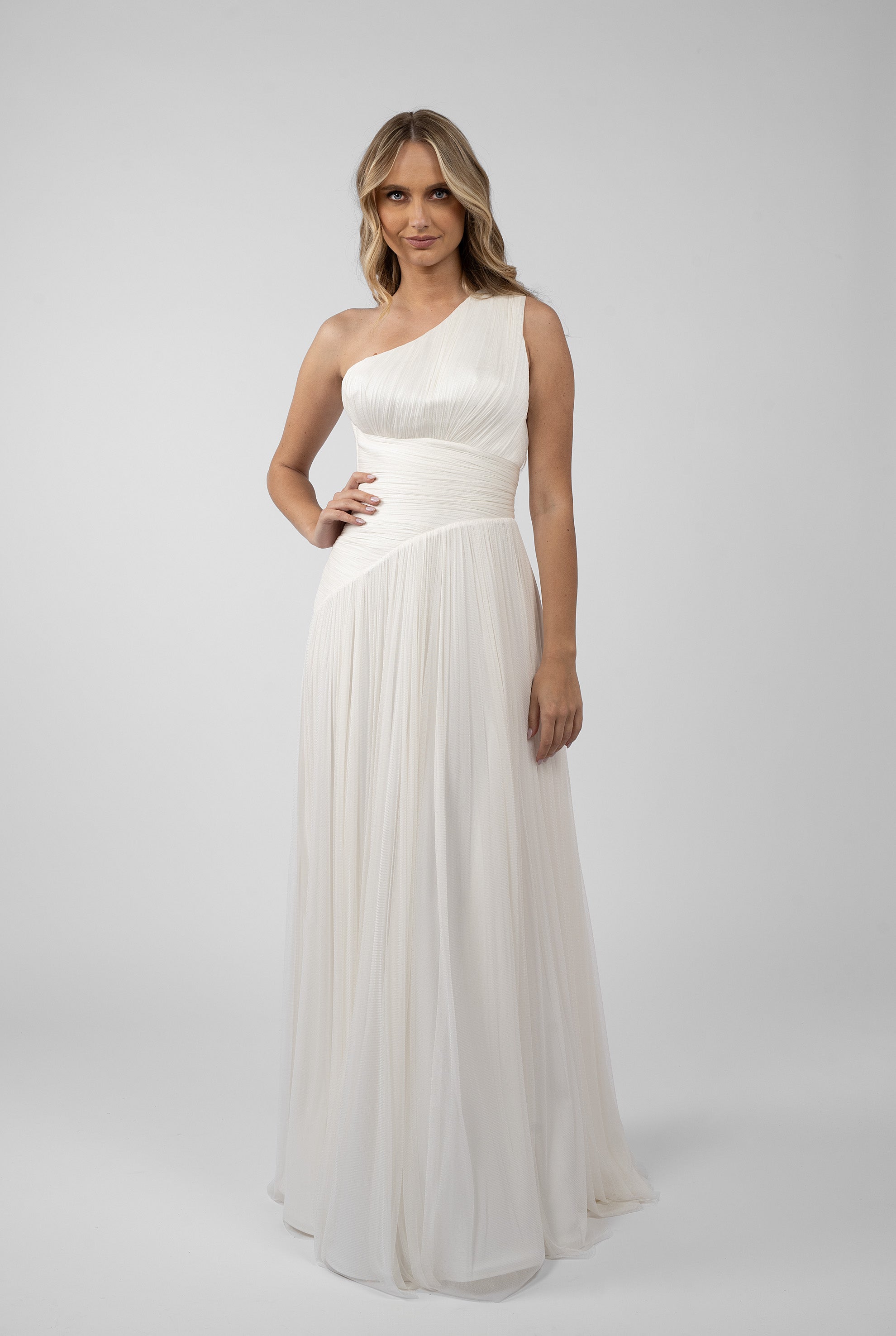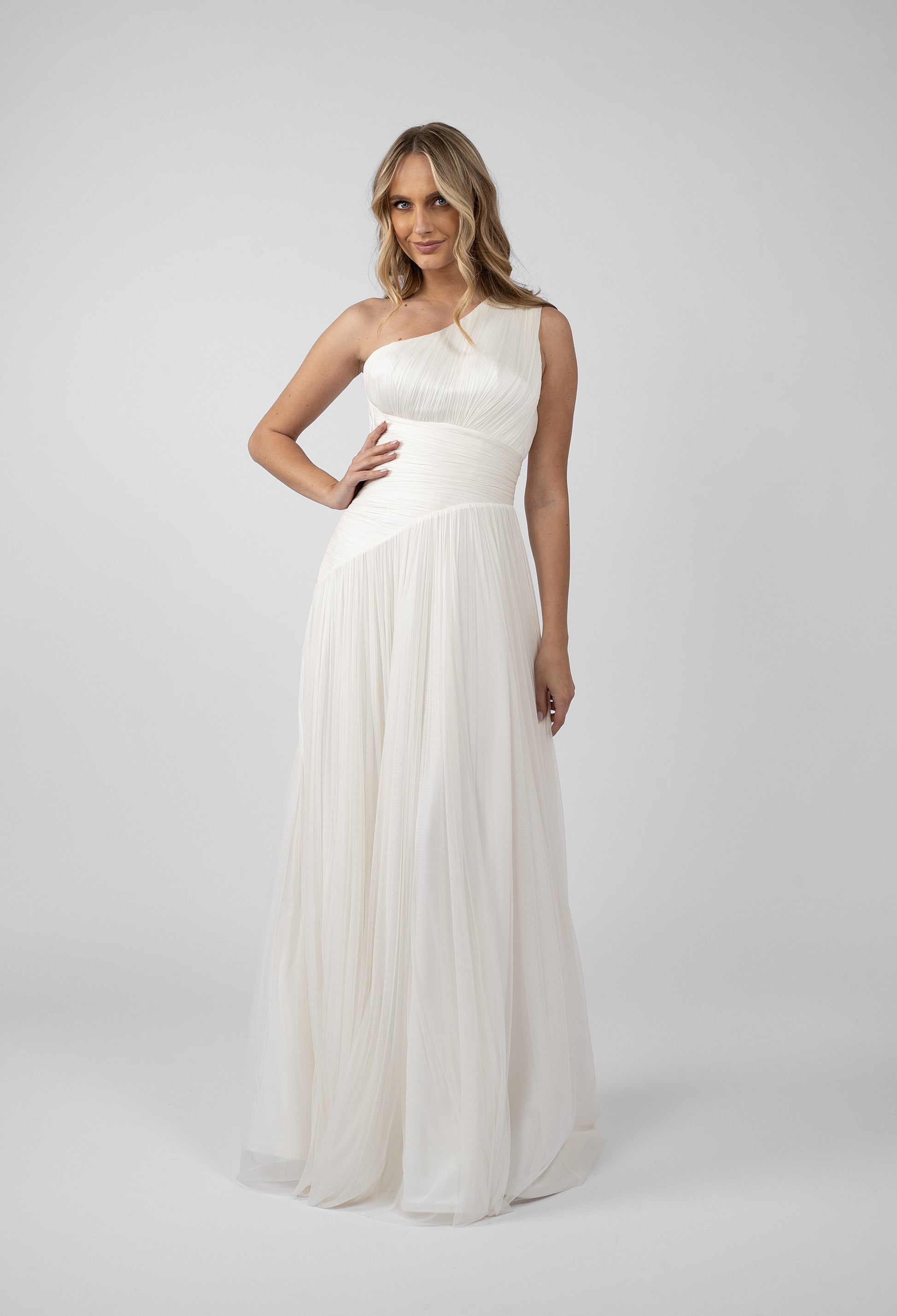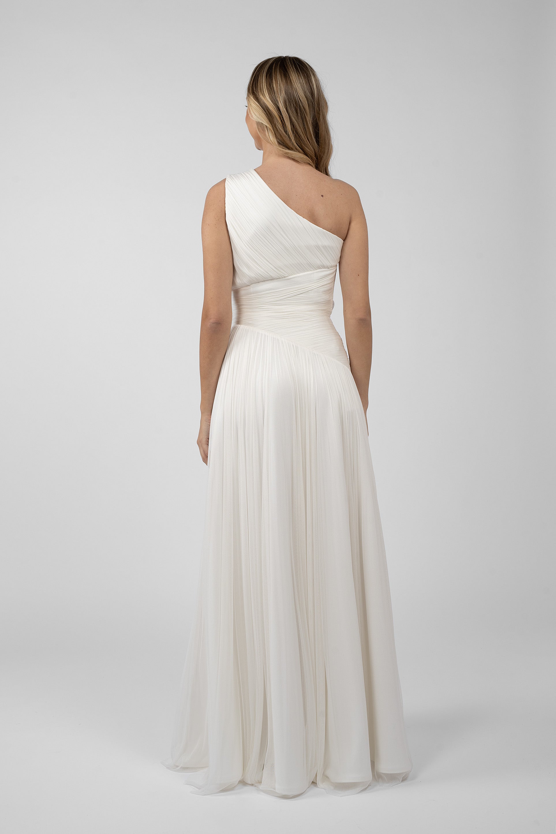 O creatie sofisticata, ce imbina simplitatea sculpturala cu rafinamentul couture. Rochia atrage prin linia sa asimetrica, ce lasa un umar descoperit, in timp ce drapajele delicate contureaza bustul si talia intr-un mod subtil si feminin. Fusta ampla, vaporoasa, curge fluid pana la podea, oferind o prezenta angelica si atemporala. O piesa statement, definita de eleganta pura si minimalism rafinat.