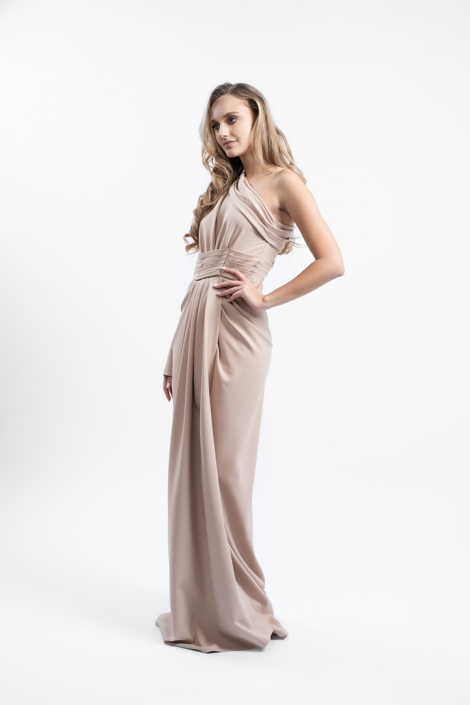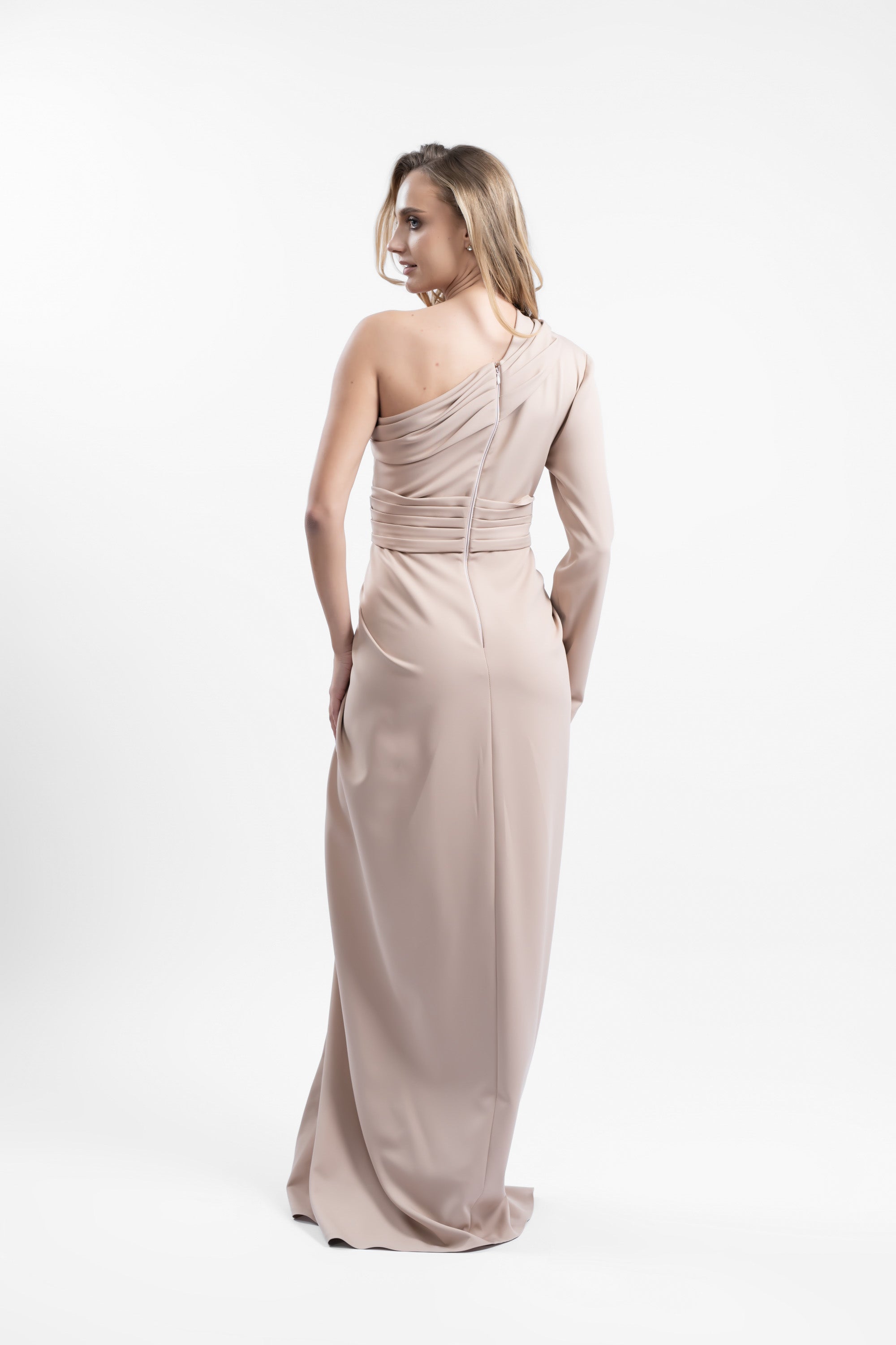 Rochie lunga intr-o nuanta sofisticata de nude care impresioneaza prin croiul asimetric, cu un umar gol si un design fluid ce evidentiaza gratia siluetei. Drapajele fine din zona bustului si taliei creeaza un efect sculptural, in timp ce fanta adanca adauga un detaliu seducator si elegant. Insertia manecii lungi pe un singur brat aduce un aer modern si sofisticat, perfect pentru o aparitie memorabila.