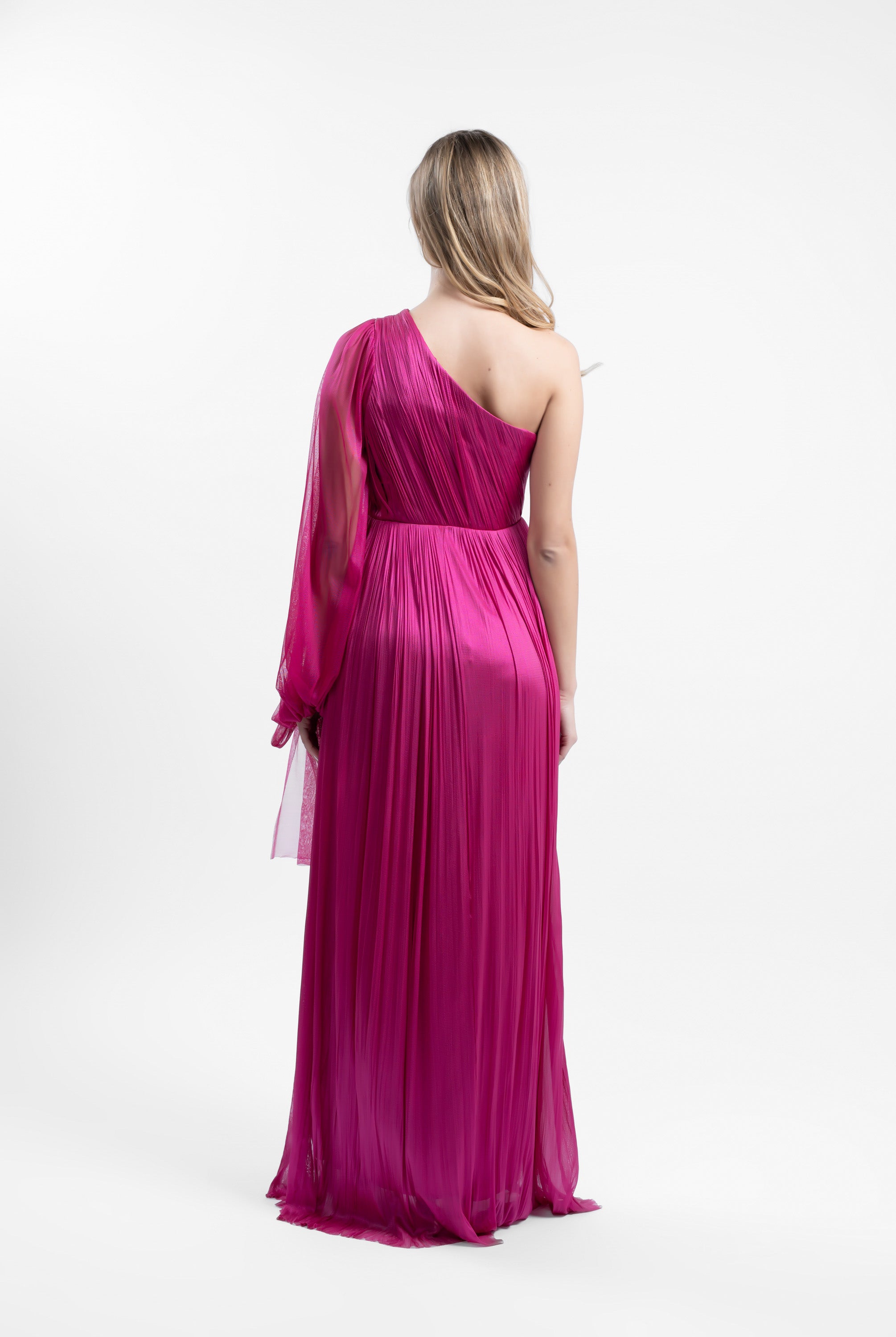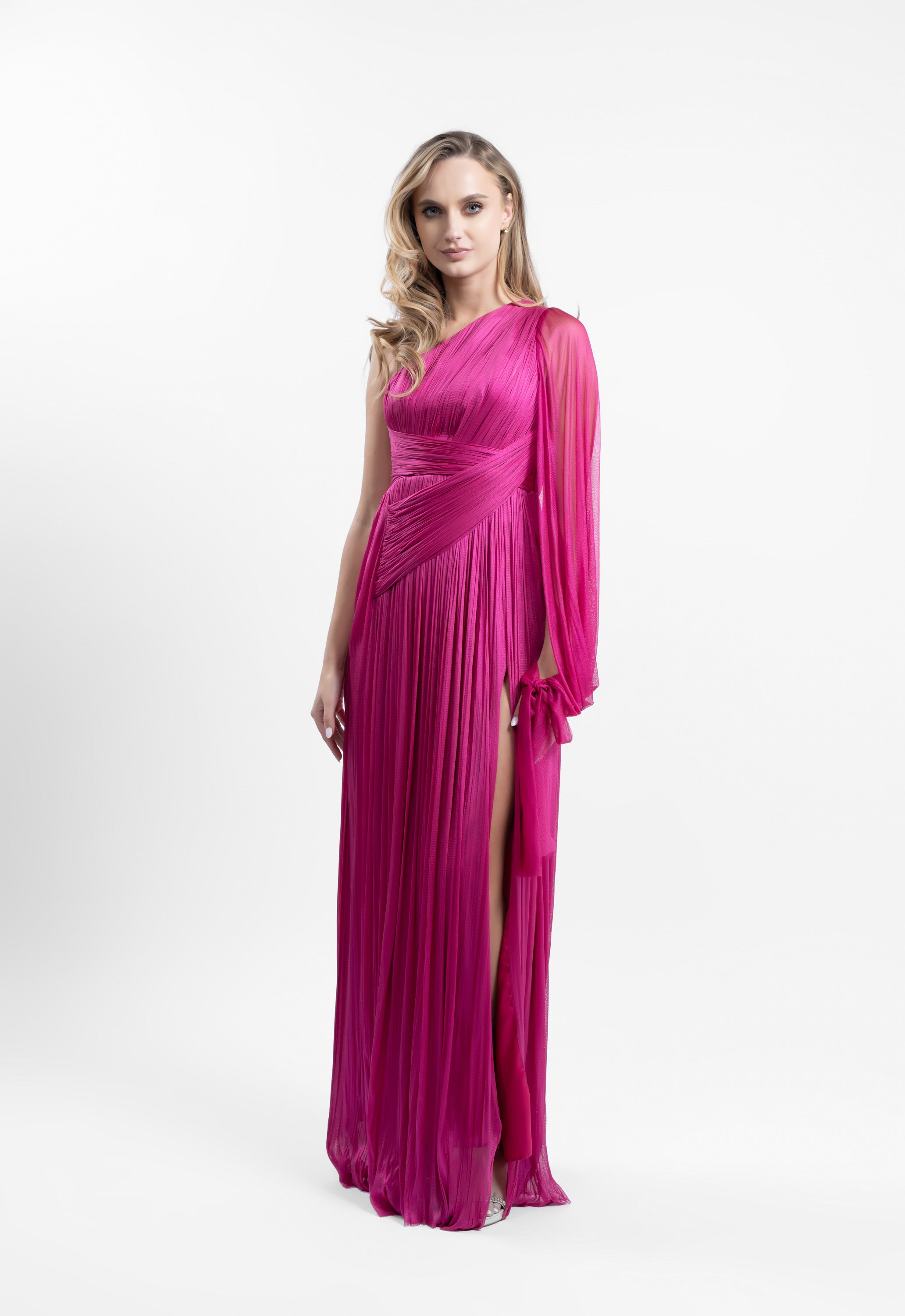 O piesa spectaculoasa ce imbina eleganta atemporala cu o nota moderna. Rochia lunga se remarca prin textura fluida a tull-ului de matase peliculizat, drapat cu maiestrie pentru a evidentia silueta. Designul este pus in valoare de maneca lunga transparenta, cu prindere delicata la incheietura, si de slit-ul adanc care confera senzualitate.