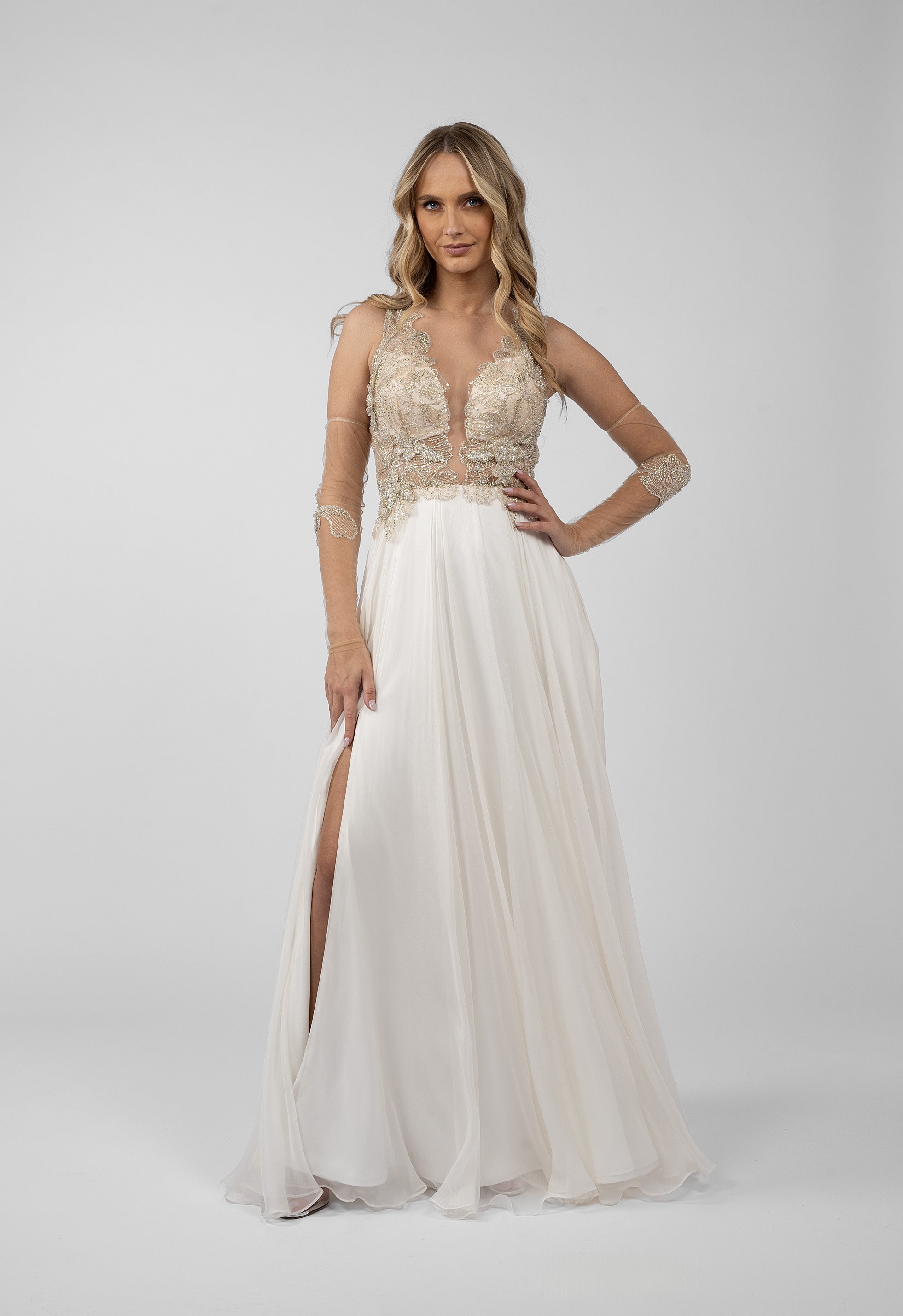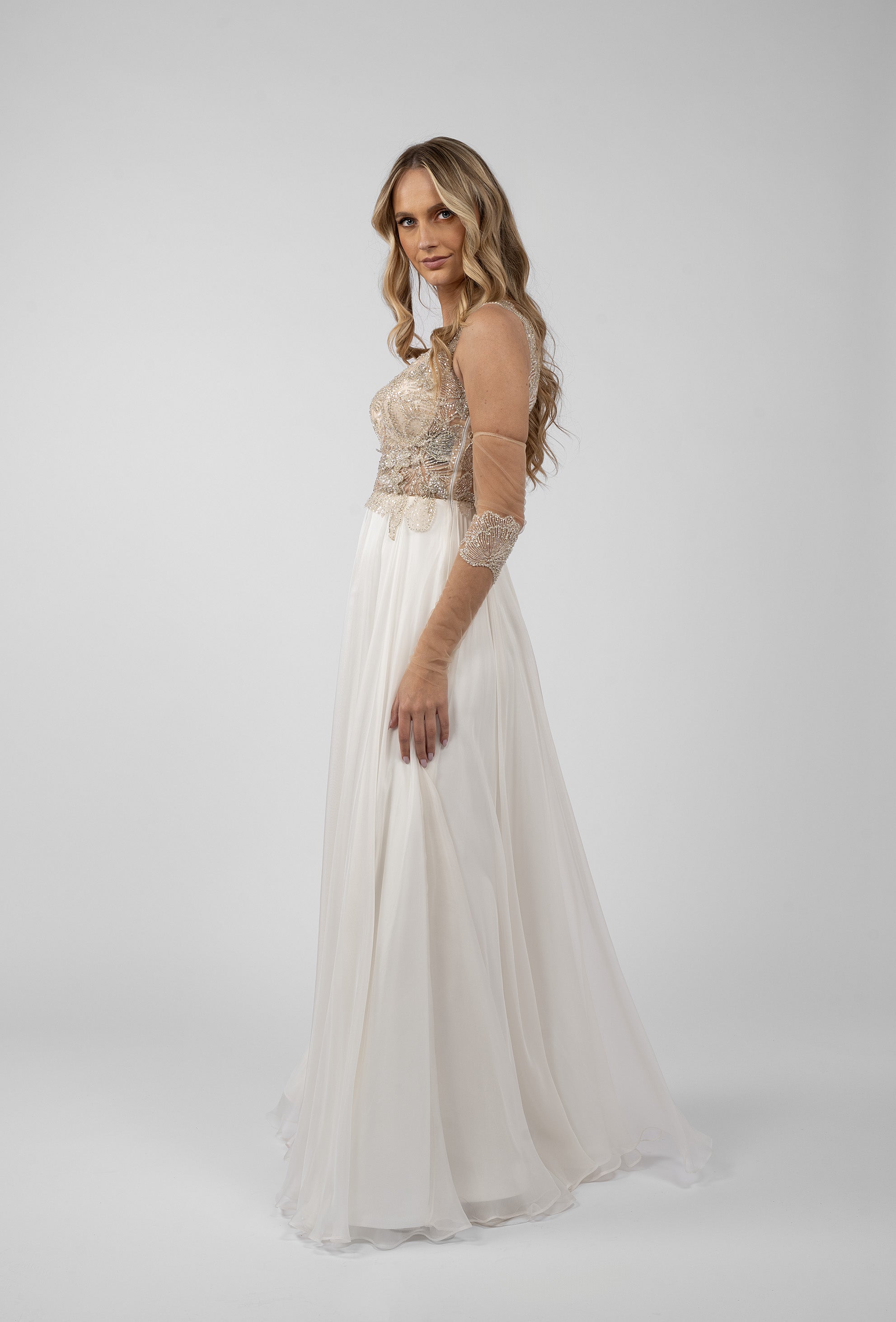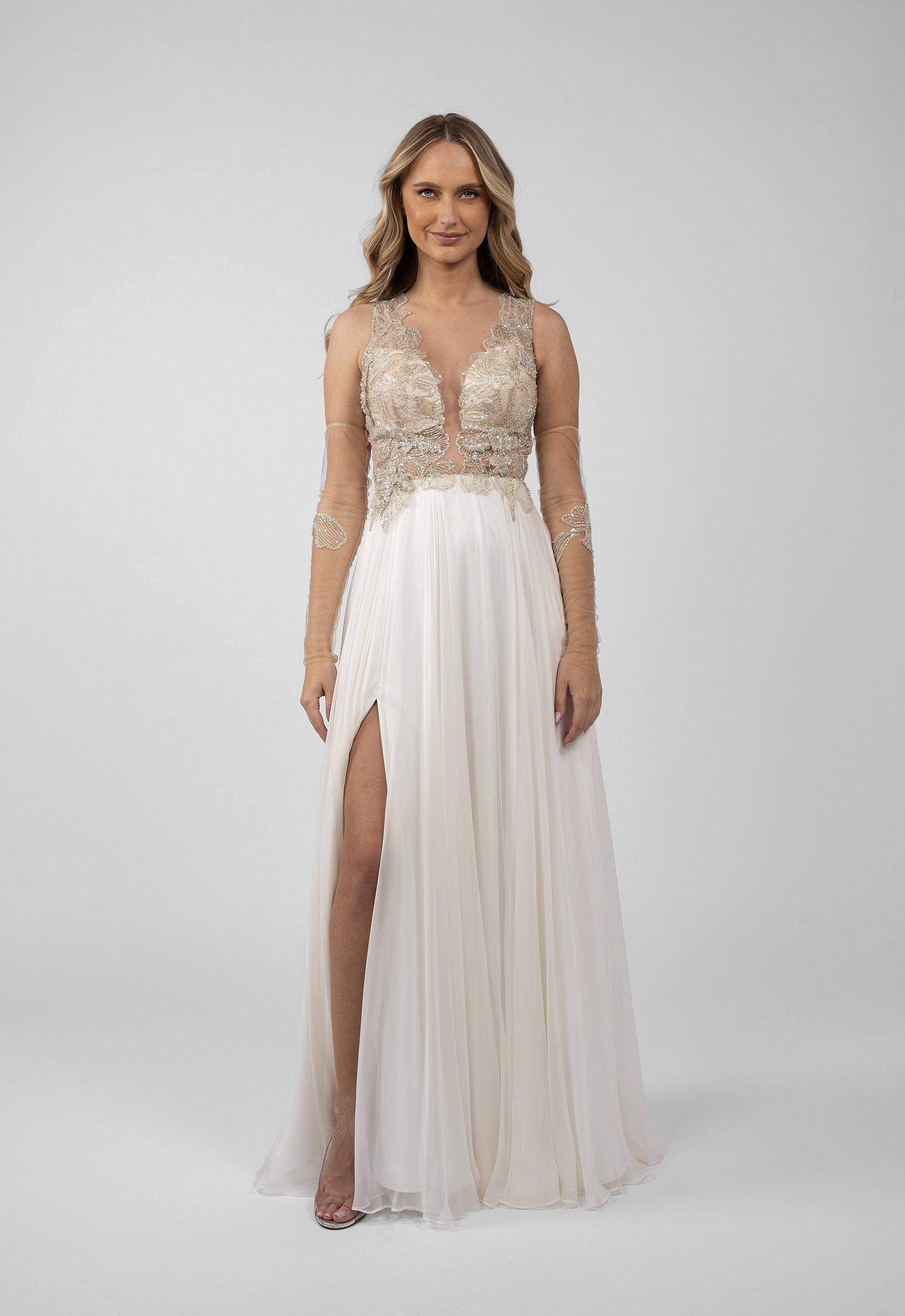 Aceasta rochie de mireasa îmbină eleganța regală cu rafinamentul modern. Bustul este realizat din tulle transparent, delicat accesorizat cu broderie  și aplicatii pretioase, creând un efect luxuriant și feminin. Mânecilor detasabile le revine rolul de a adăuga versatilitate, oferind miresei două ipostaze stilistice într-o singură creație. Fusta amplă din voal de mătase curge fluid, completată de un slit lateral ce aduce un detaliu seducător și sofisticat. O alegere de impact pentru mireasa care își dorește o apariție memorabilă și plină de grație.