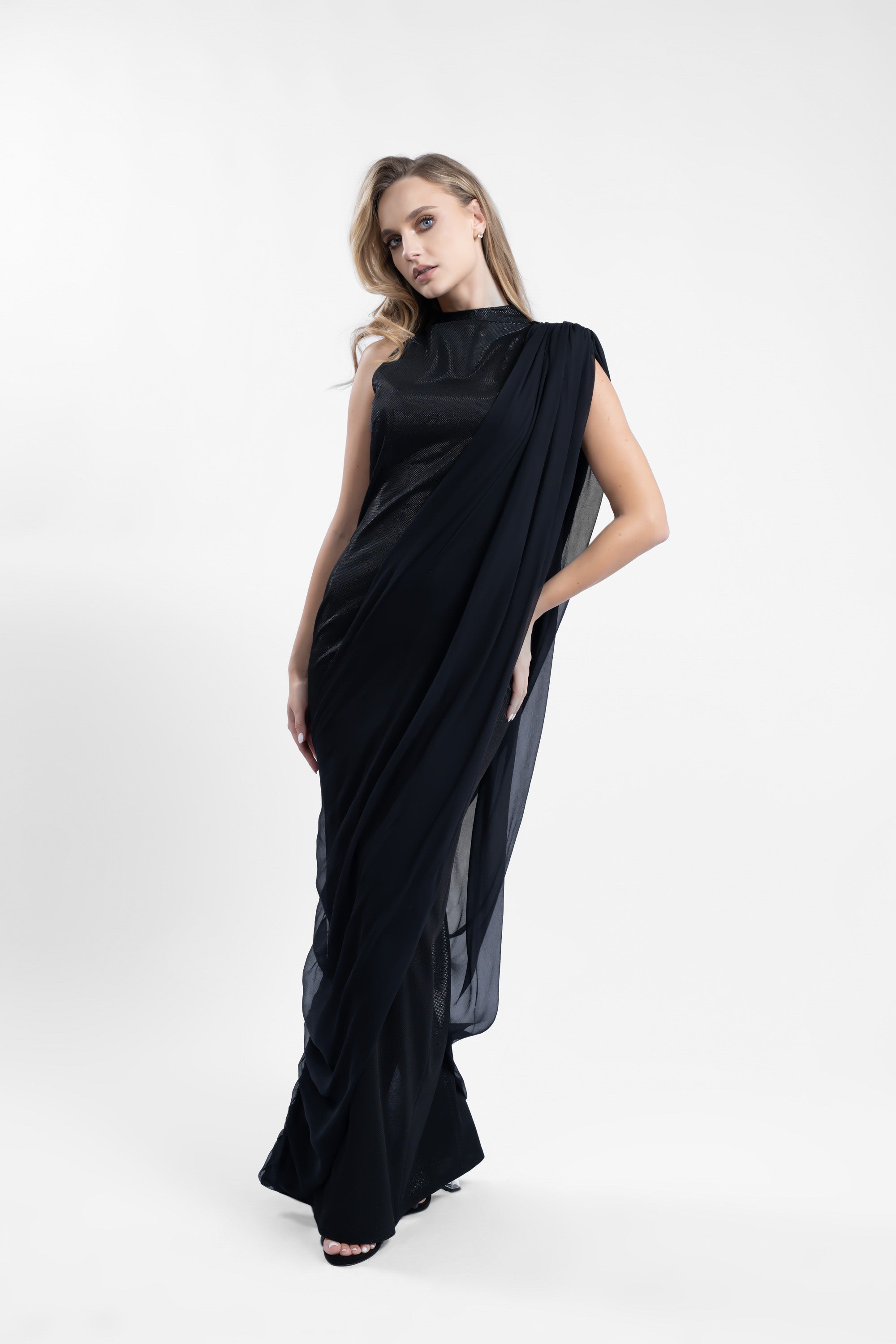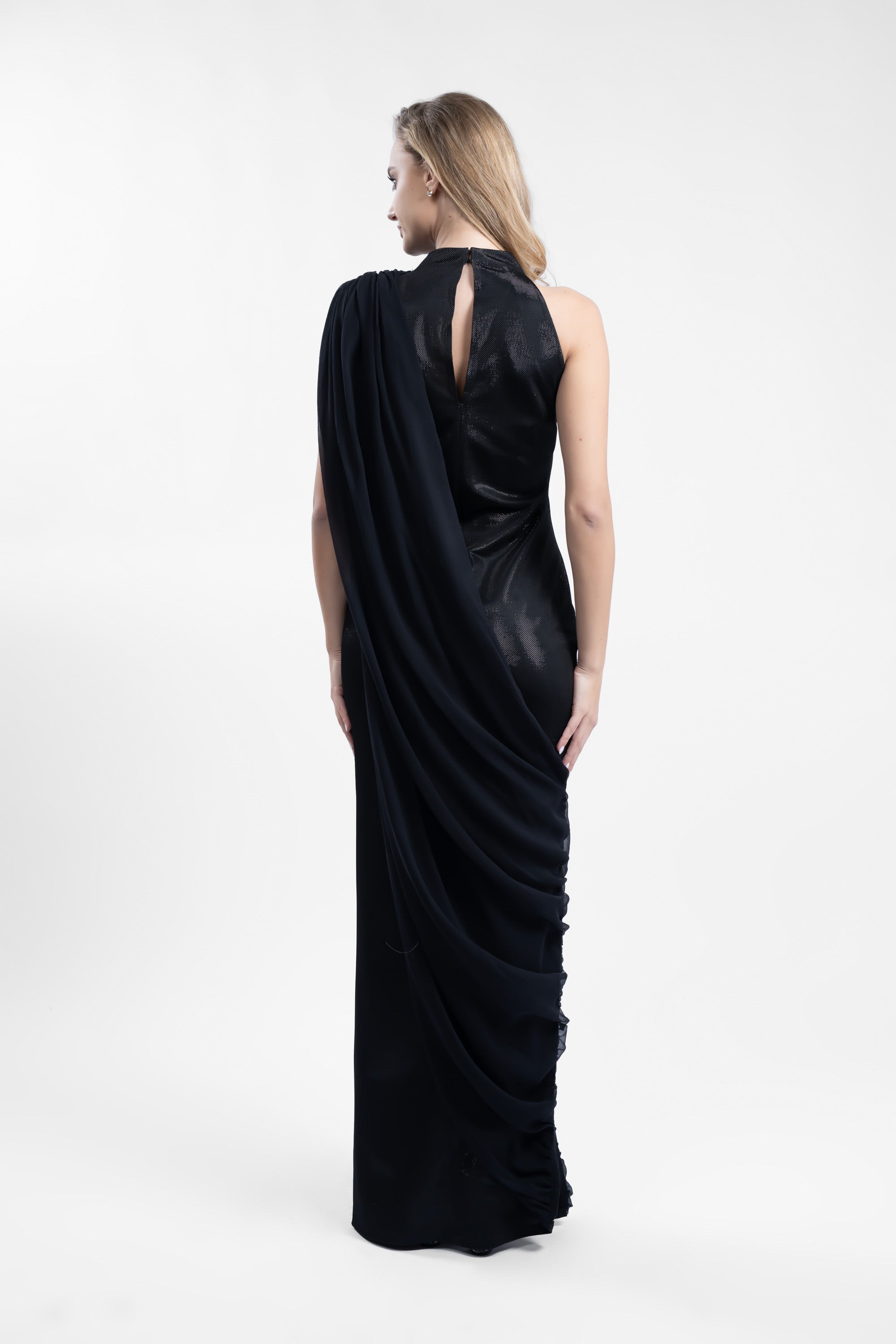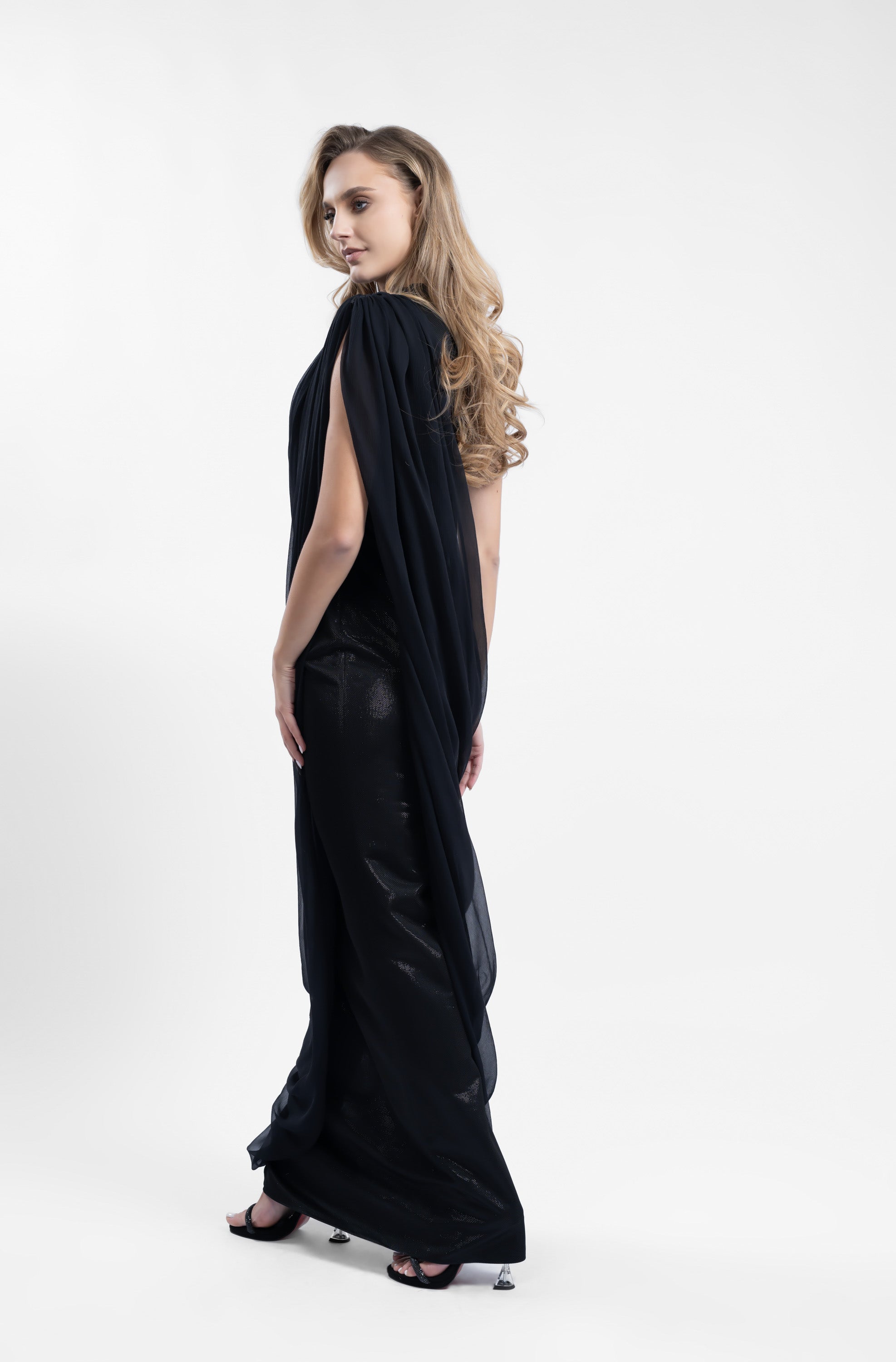 Croială: Partea superioara fara maneci, guler inalt, drapaj amplu asimetric peste un umar, fusta lunga mulata cu strat exterior vaporos tip capa.