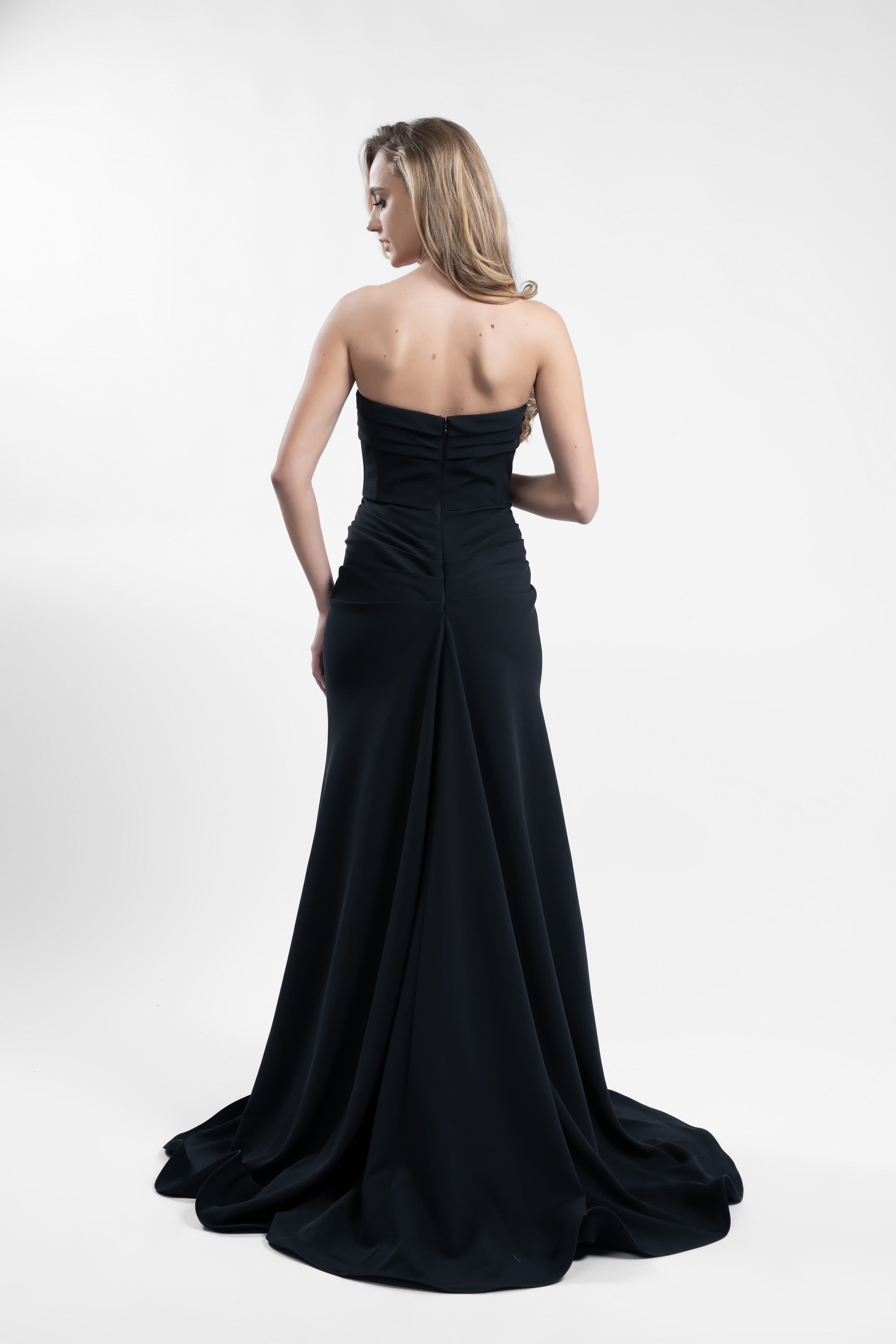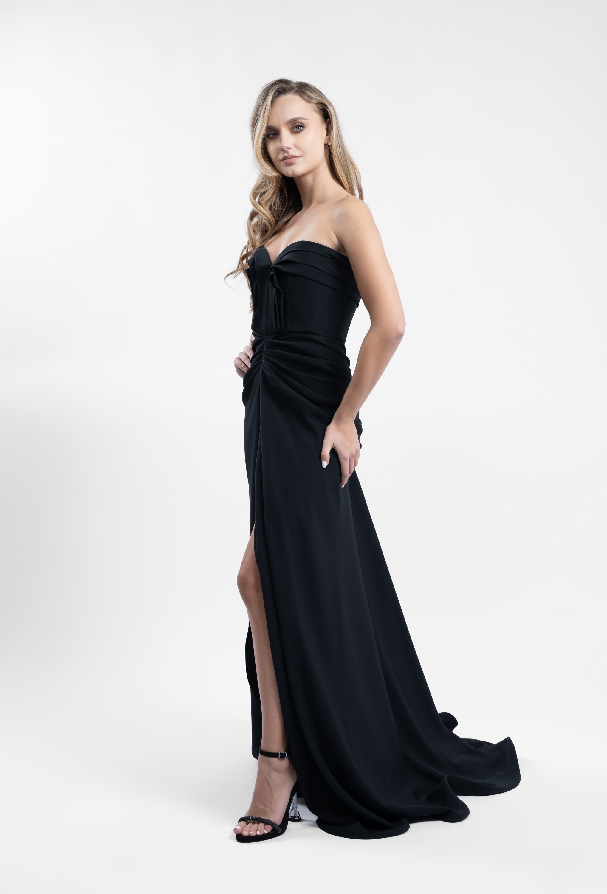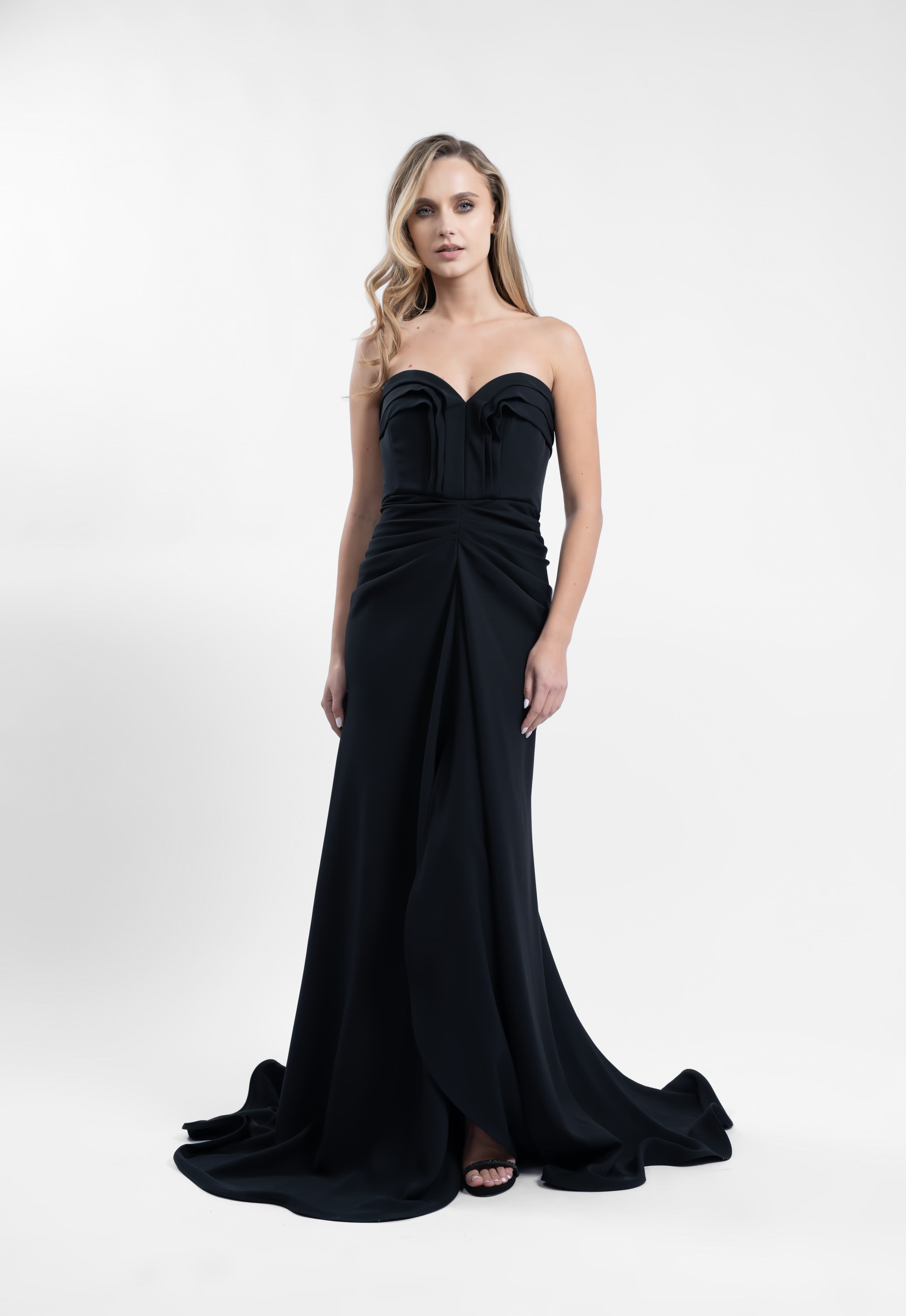O rochie neagra de seara, definita prin linii sculpturale si eleganta atemporala. Bustul tip corset evidentiaza decolteul cu detalii reliefate fine, in timp ce drapajele din talie alungesc silueta si contureaza subtil formele. Fusta ampla, cu deschidere naturala in fata si trena fluida, aduce un aer de gratie sofisticata, creand o tinuta spectaculoasa si feminina.