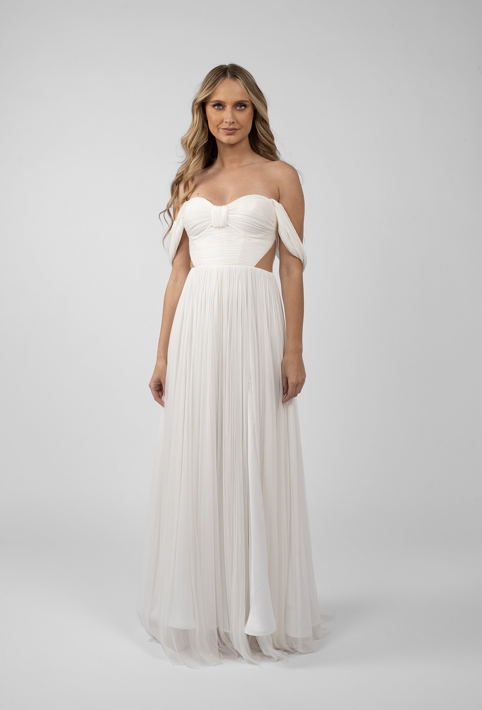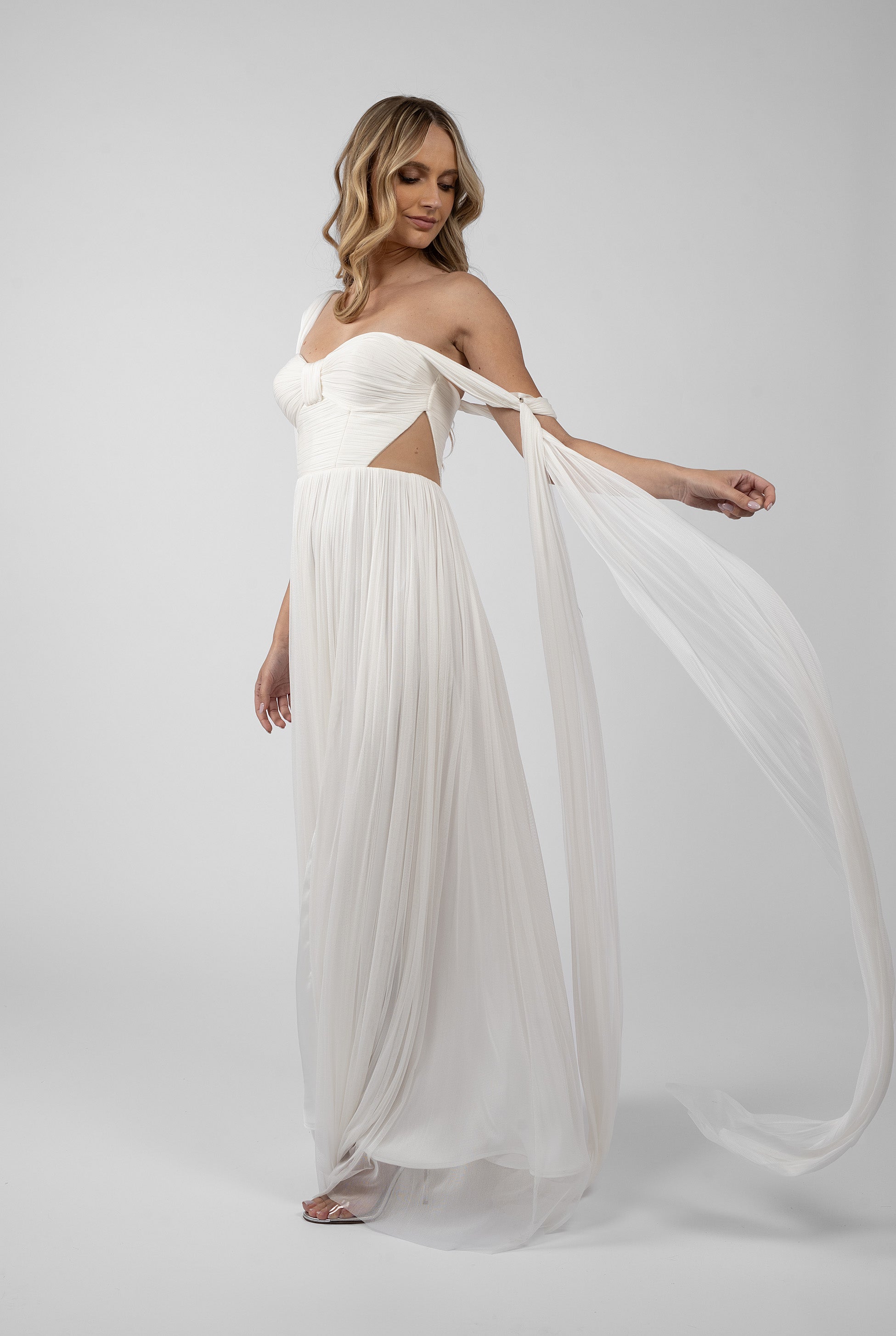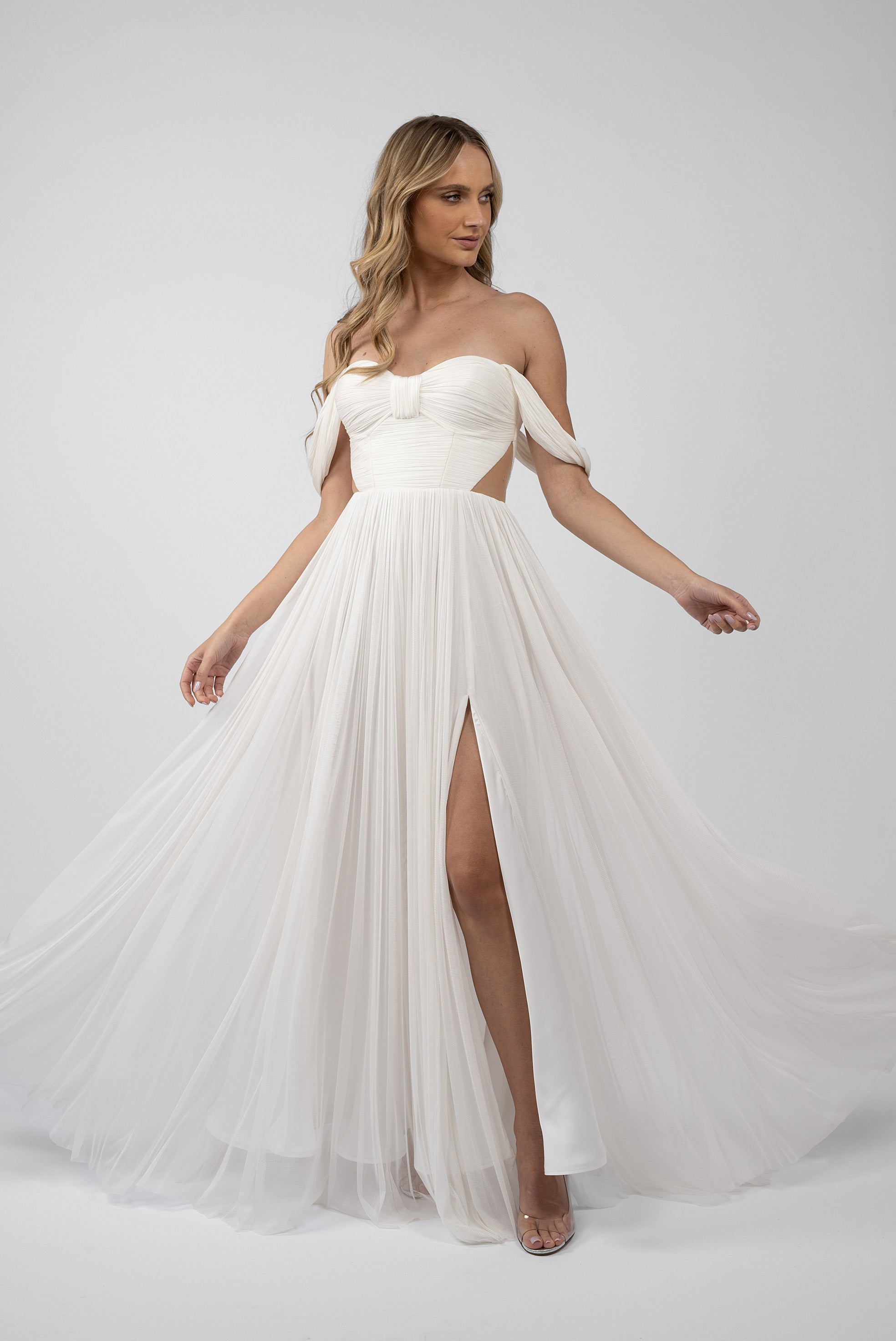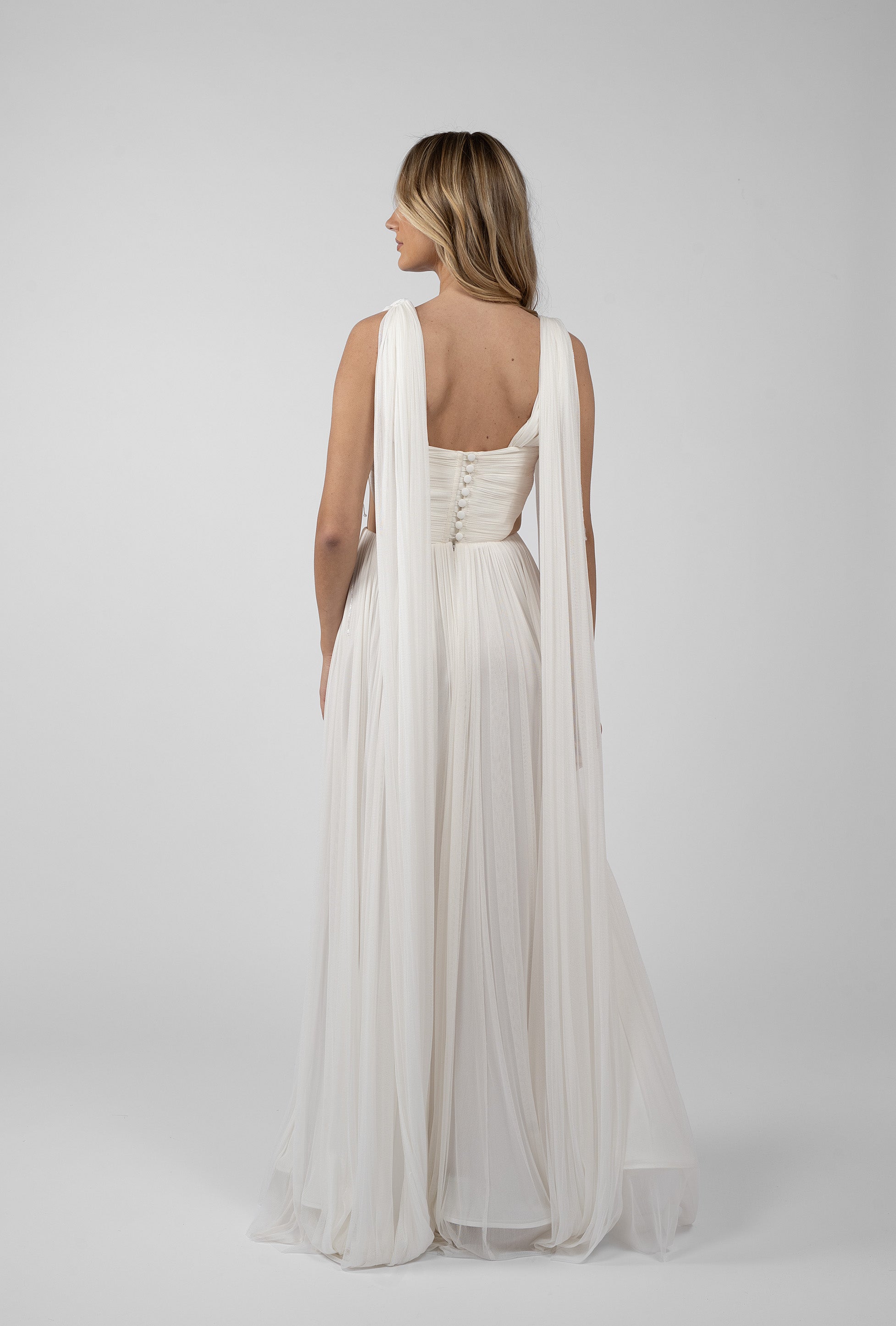 O rochie impresionanta, ce imbina senzualitatea cu fluiditatea delicata a tullului. Bustul fronsat evidentiaza silueta, in timp ce decupajele laterale subtile si slit-ul frontal adauga un plus de dinamism si feminitate. Esarfele lungi cu swarovski, detasabile, amplifica spectaculozitatea look-ului si pot fi purtate liber sau legate, oferind versatilitate si un efect dramatic.
