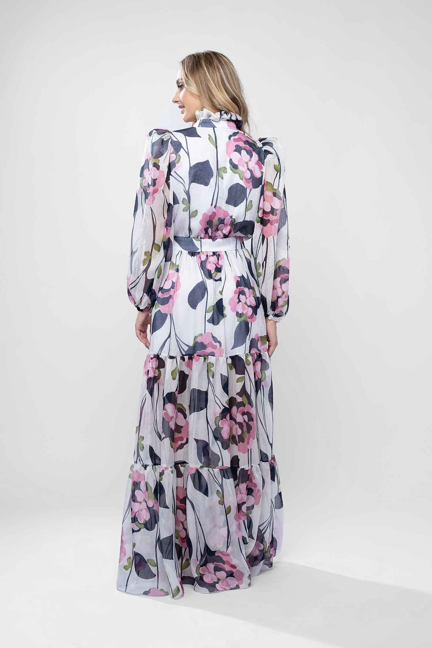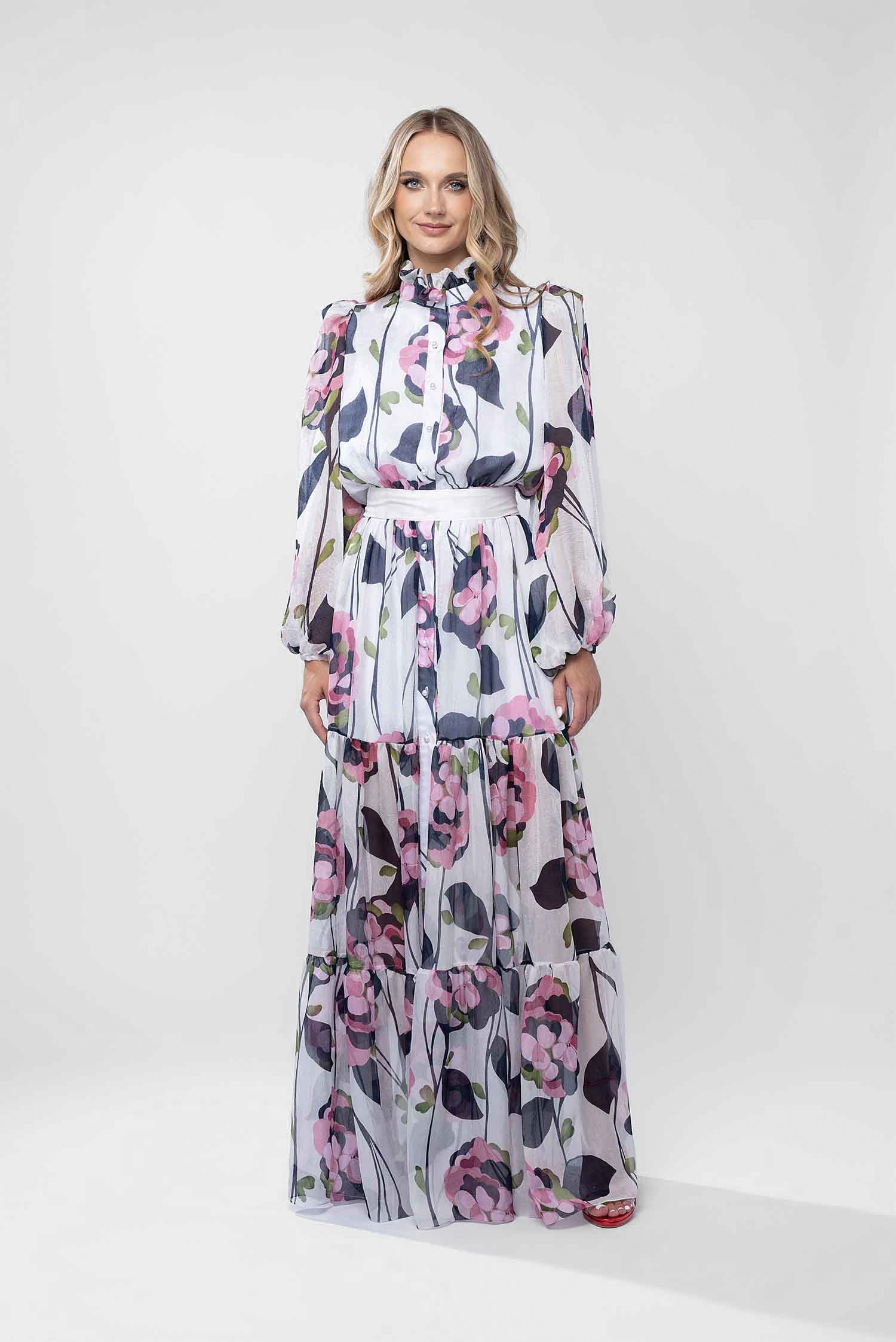 O piesa cu aer regal si accente romantice, aceasta rochie lunga este realizata din voal fin imprimat cu flori picturale in nuante delicate de roz si indigo. Gulerul inalt cu volan discret si manecile lungi, usor bufante, echilibreaza perfect fusta ampla, construita din volane. Talia este marcata printr-un cordon lat care defineste elegant silueta. O alegere sofisticata, ideala pentru evenimente de zi sau serate rafinate.