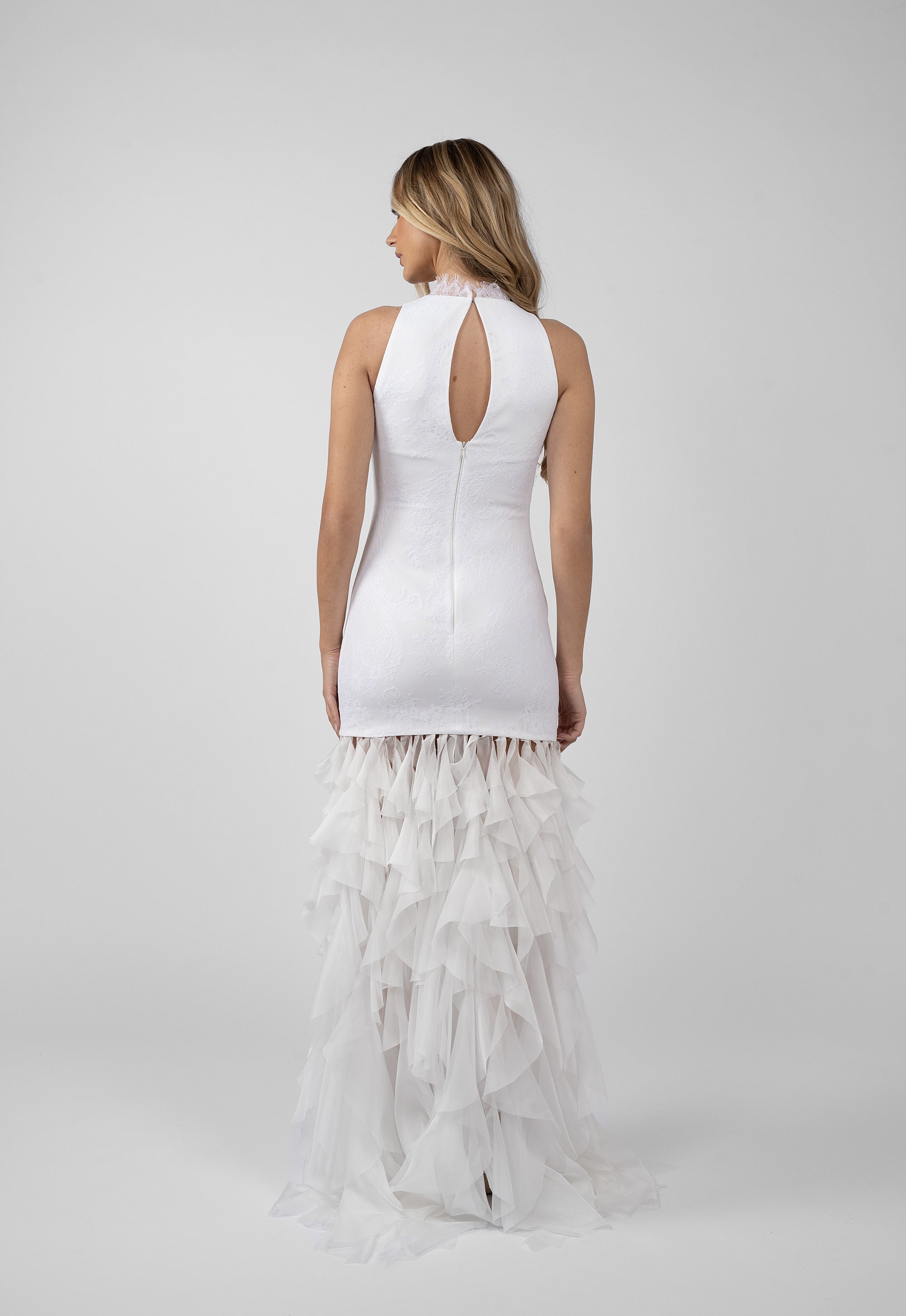 Aceasta rochie atrage prin eleganta sa senzuala si detaliile spectaculoase. Bustul  minimalist, cu linie inalta si delicat conturat, imbracat in chantilly pune accent pe rafinament, in timp ce partea inferioara surprinde prin jocul de volum creat de multiplele volane vaporoase. Este o piesa de impact, sofisticata si moderna, ce imbina misterul cu feminitatea.