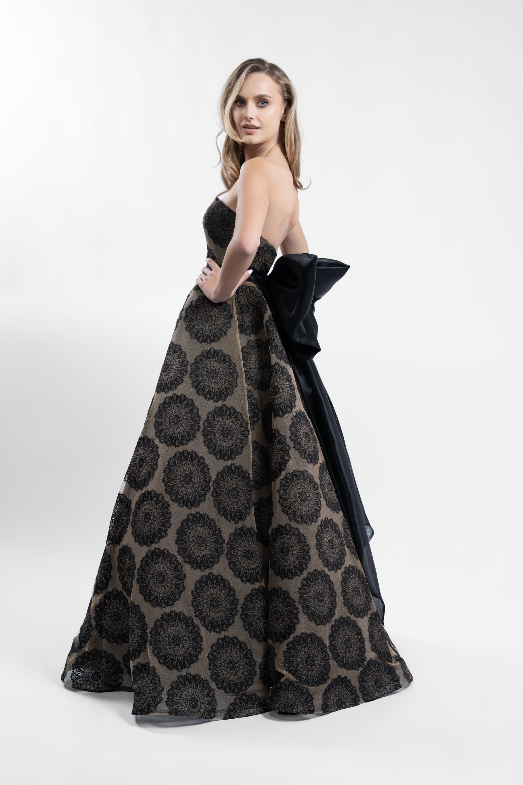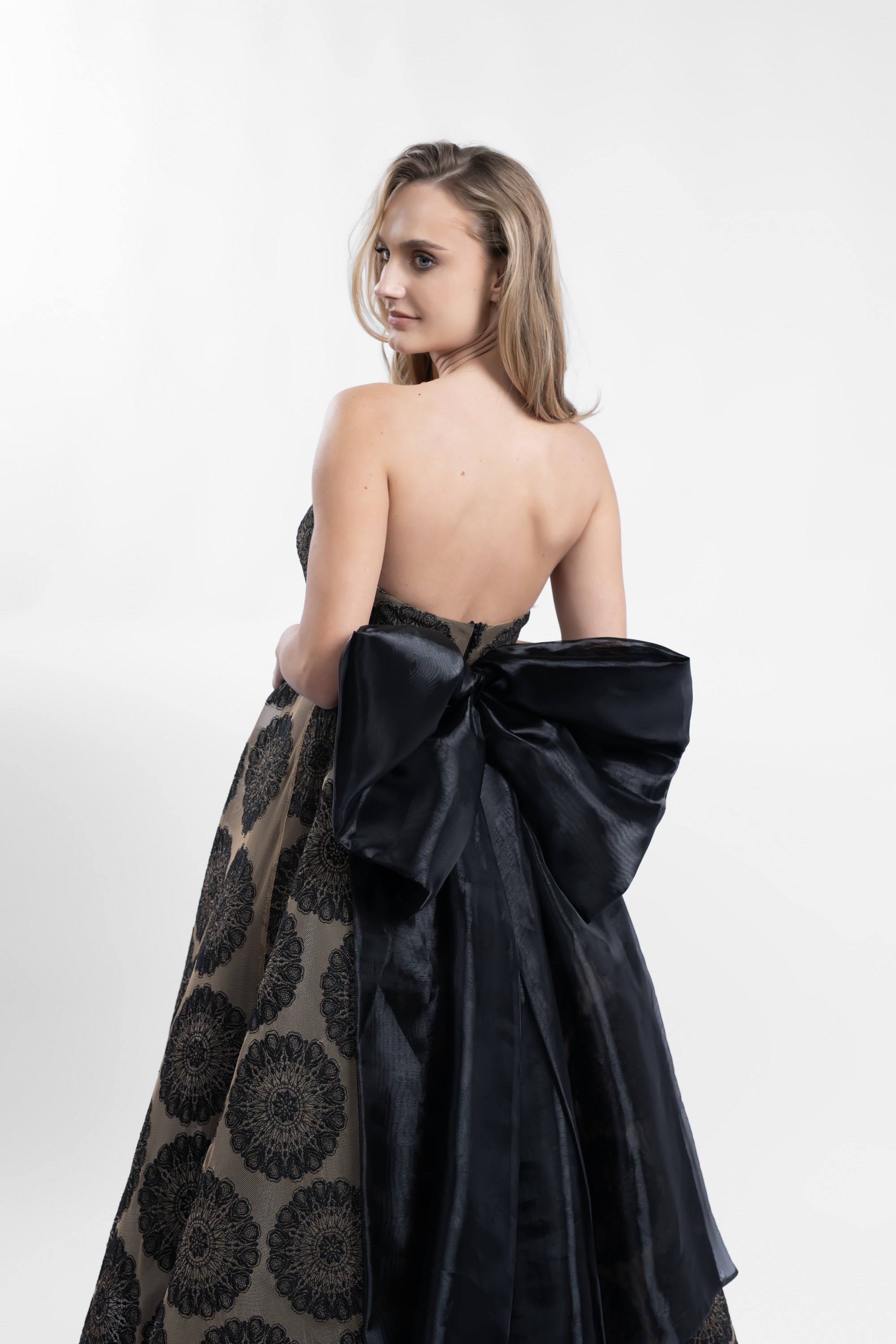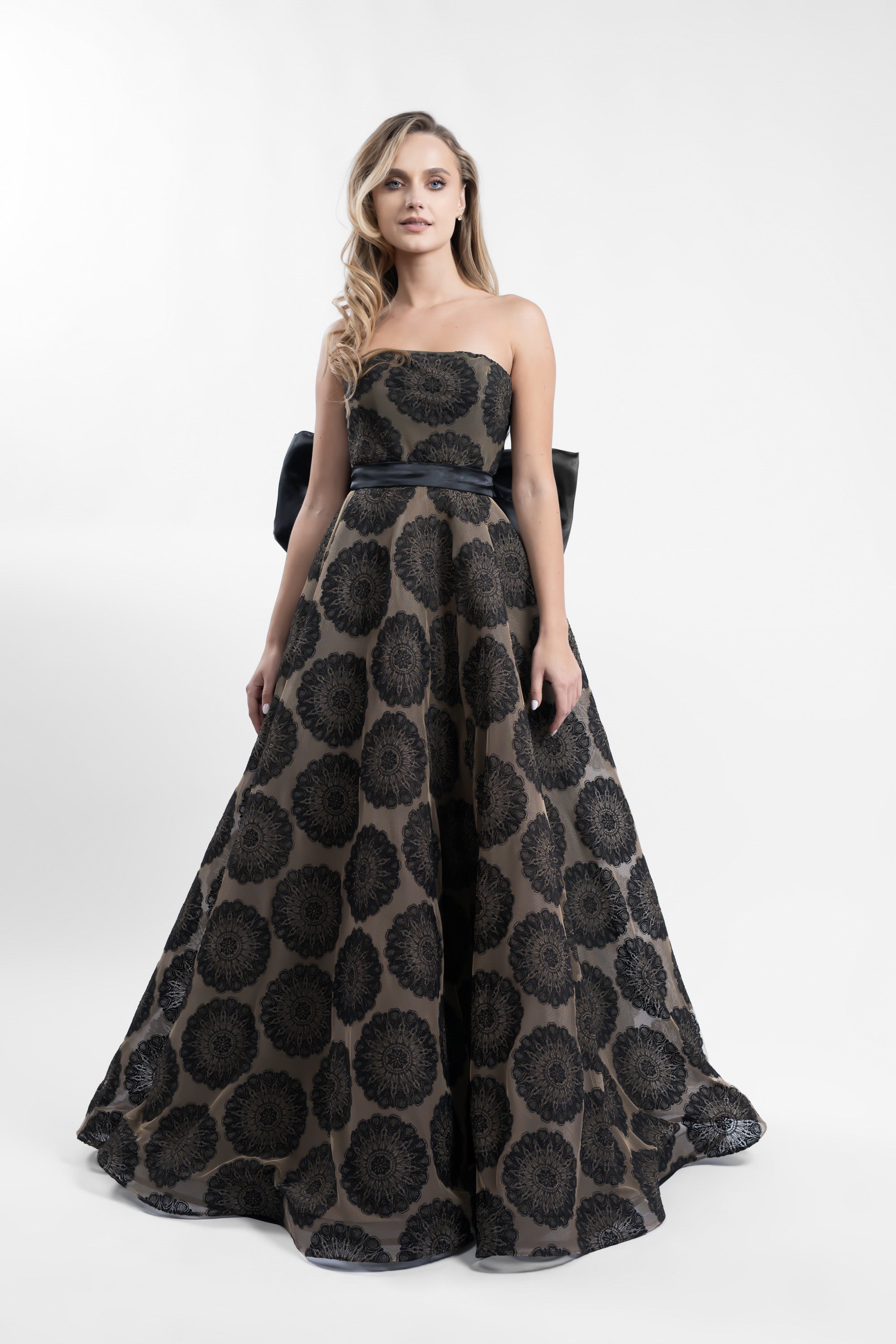 O rochie spectaculoasa, realizata din broderie de bumbac cu motive circulare, care imbina eleganta clasica cu un detaliu modern de impact. Bustul este tip corset fara bretele, sustinand frumos linia decolteului, in timp ce fusta ampla in clos cu crinolon creeaza un efect fluid si impunator la mers. Talia este accentuata de o funda supradimensionala detasabila din organza neagra, asezata la spate, ce transforma tinuta intr-o aparitie statement.