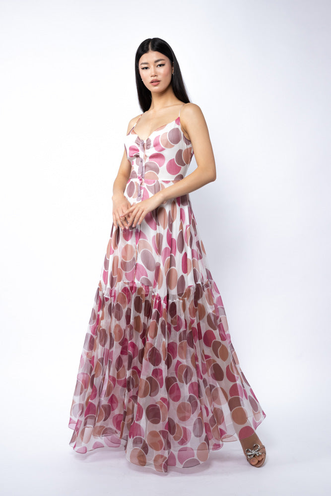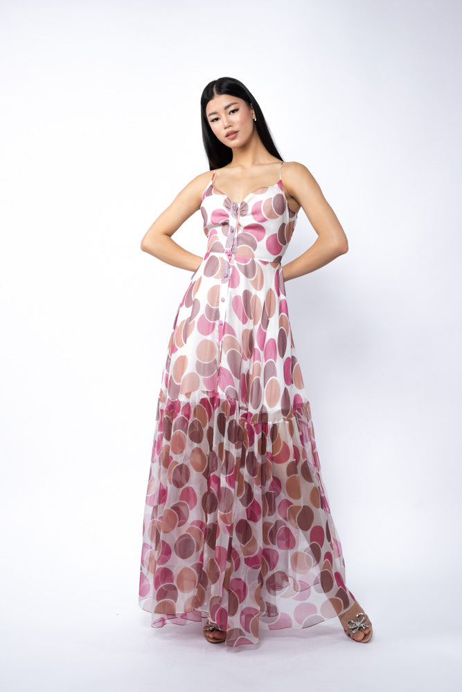 Rochie maxi vaporoasa realizata din matase delicata, decorata cu imprimeu polka dots pentru un efect jucaus si feminin. Modelul este prevazut cu bretele subtiri, decolteu in V, nasturi pe bust si cordon din acelasi material, care accentueaza talia. Fusta ampla, cu volum si rascroiala ampla la spate, confera lejeritate si fluiditate.