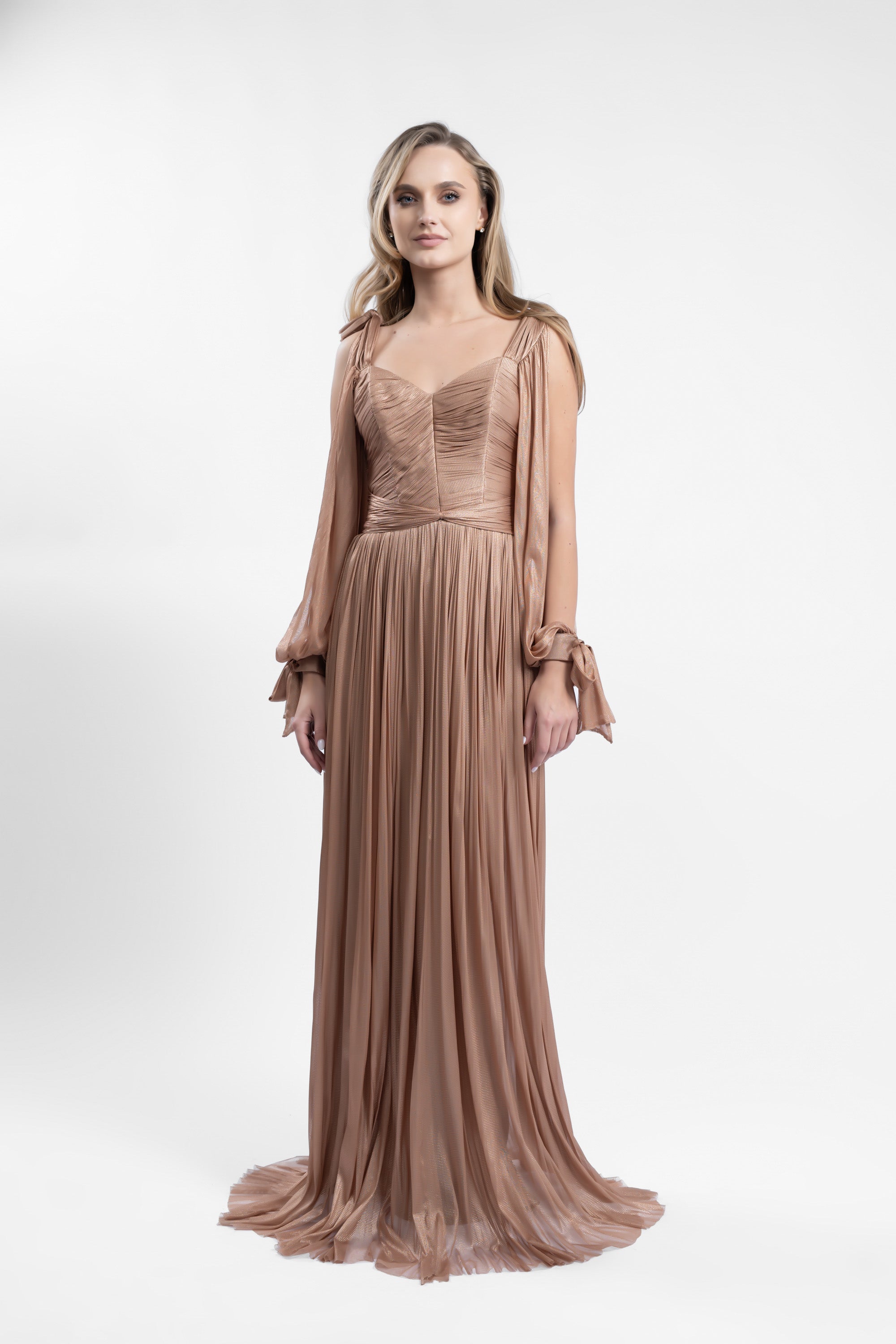 O rochie spectaculoasa, realizata din tull de matase peliculizat, ce imbina rafinamentul clasic cu o nota moderna. Bustul fronsat cu efect de corset subliniaza delicat silueta, iar bretelele legate pe umeri se prelungesc in maneci fluide, cu detalii romantice la incheietura. Fusta ampla, fronsata, cade lejer creand miscare si luminozitate la fiecare pas.