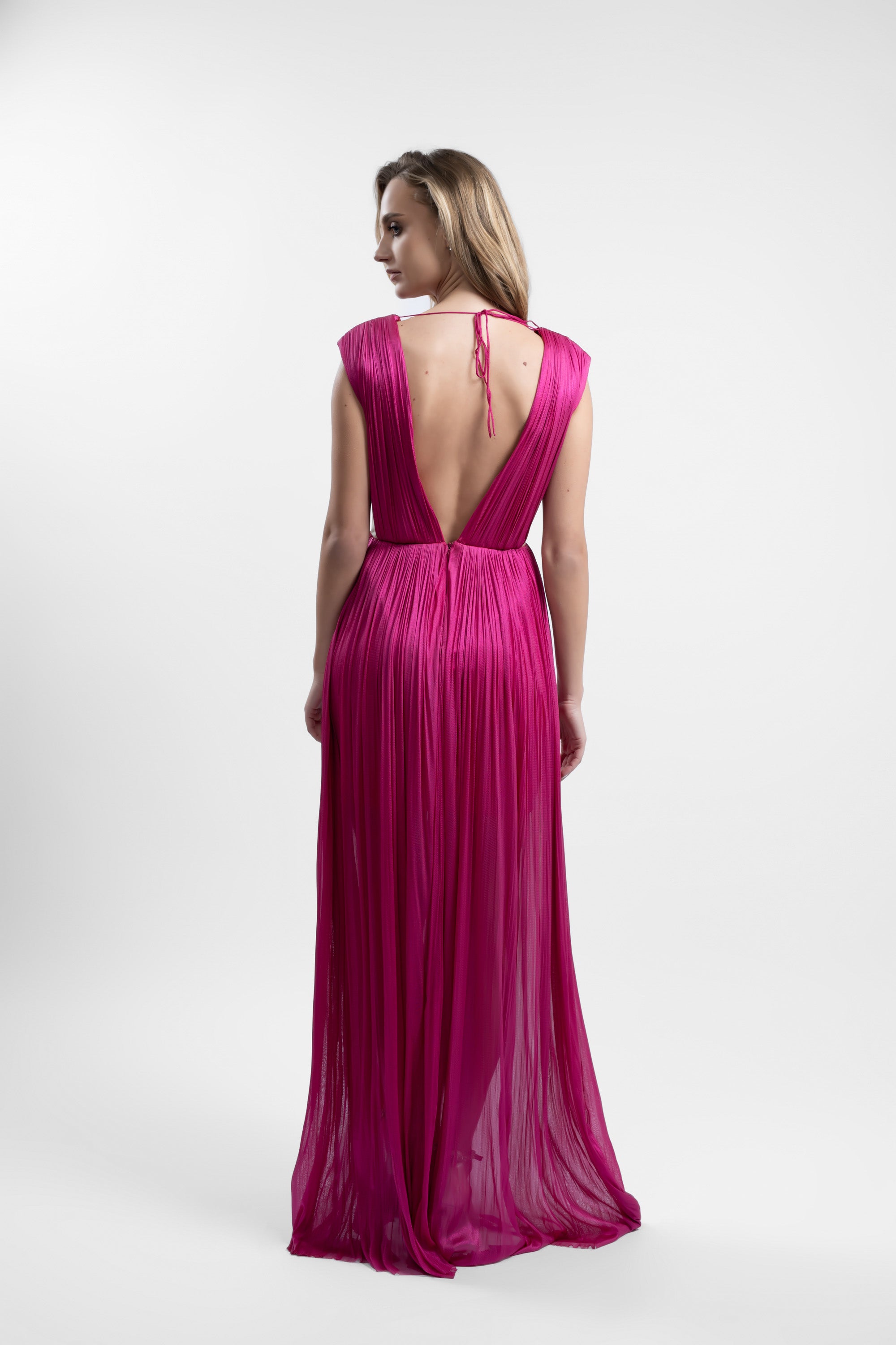 Rochia lunga din tulle de matase peliculizat impresioneaza prin textura fluida si stralucirea subtila. Bustul este pus in valoare de detalii drapate incrucisate, ce accentueaza talia si creeaza un efect sculptural. Spatele adanc, legat delicat cu panglici subtiri, adauga senzualitate, in timp ce faldurile ample curg natural pana la podea, subliniind eleganta feminina.