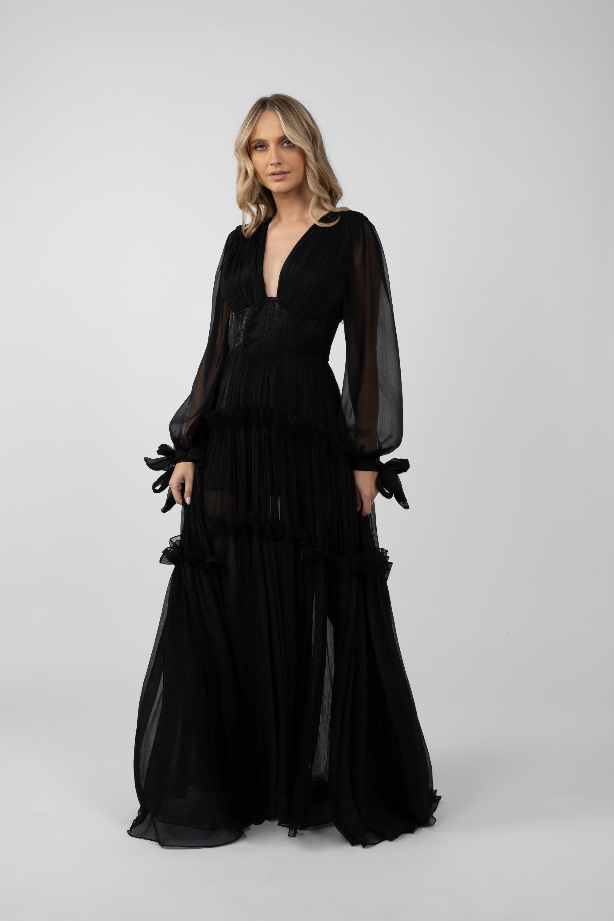 O rochie spectaculoasa, definita de echilibrul dintre senzualitate si rafinament. Bustul adanc in V si corseleta din talie sculpteaza silueta, in timp ce manecile lungi transparente adauga un aer misterios. Spatele gol completeaza look-ul cu un detaliu irezistibil, iar fusta ampla din voal de matase creponat curge fluid, creand miscare si volum.