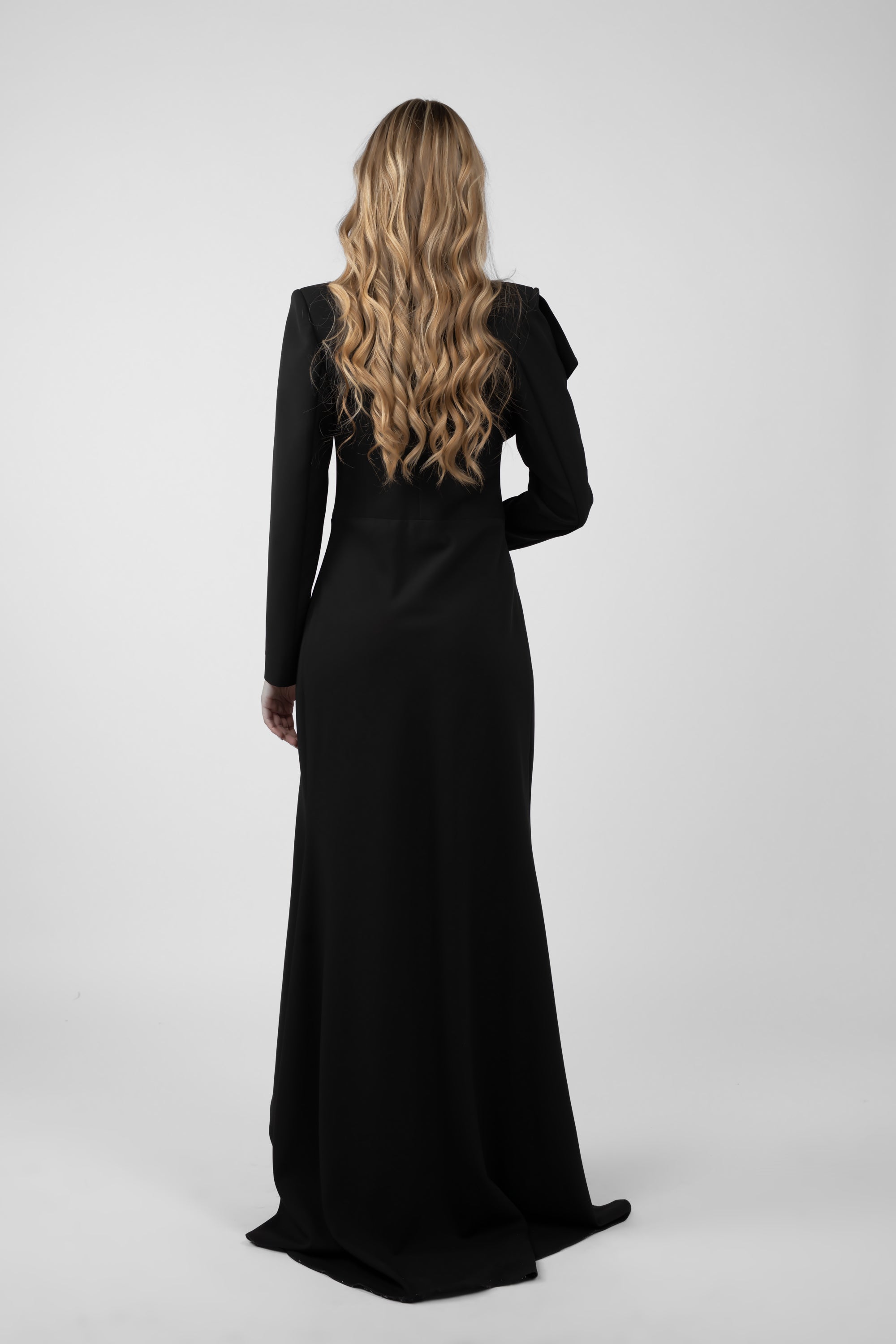 Rochia lunga neagra atrage prin eleganta dramatica si detaliul unic al reverului lat, purtat asimetric. Bustul este conturat prin croiala petrecuta, cu decolteu adanc in V ce subliniaza feminitatea. Talia bine definita pune in valoare silueta, iar fusta lunga cu slit frontal adauga fluiditate si senzualitate in miscare. O piesa statement, moderna si sofisticata, ce reinventeaza clasica rochie de seara.