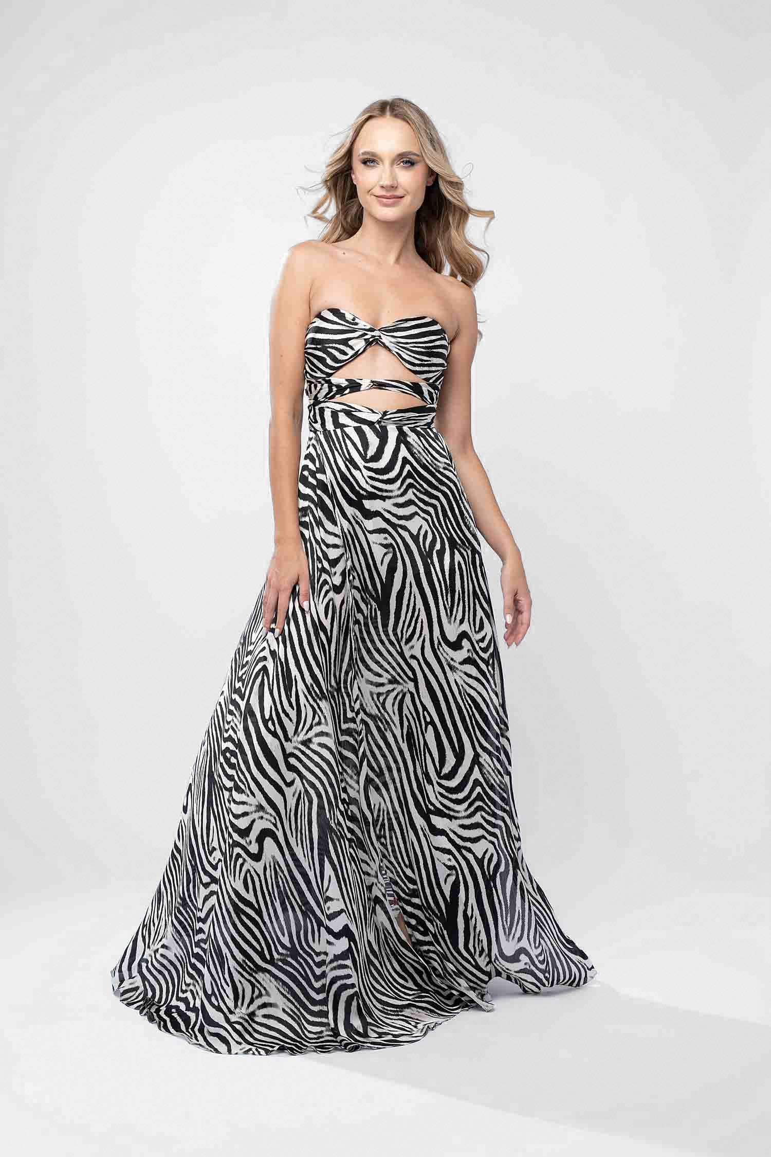 Rochie lunga cu imprimeu zebra, definita de un bust rasucit cu decupaj central si detalii ce subliniaza talia. Spatele are inchidere cu snur si funda, accentuand linia feminina. Fusta ampla, cu slit dublu in fata, creeaza miscare fluida si un efect grafic spectaculos.