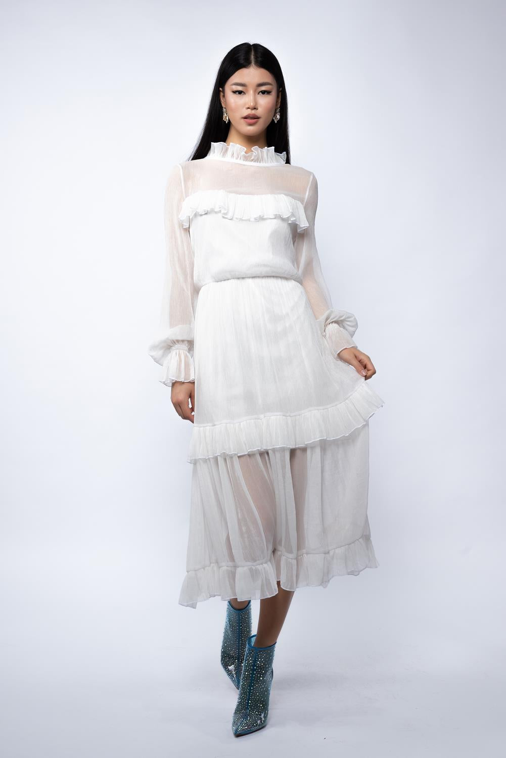 Rochia perfecta pentru un look diafan si romantic, reinterpretat cu rafinament. Cu o textura vaporoasa si semi-transparenta, acest model midi evidentiaza feminitatea prin jocul subtil de volane, gulerul rulat si manecile lungi cu terminatii ample. Eleganta sa rafinata o transforma intr-o alegere ideala atat pentru evenimente speciale, cat si pentru aparitii effortless de zi.
