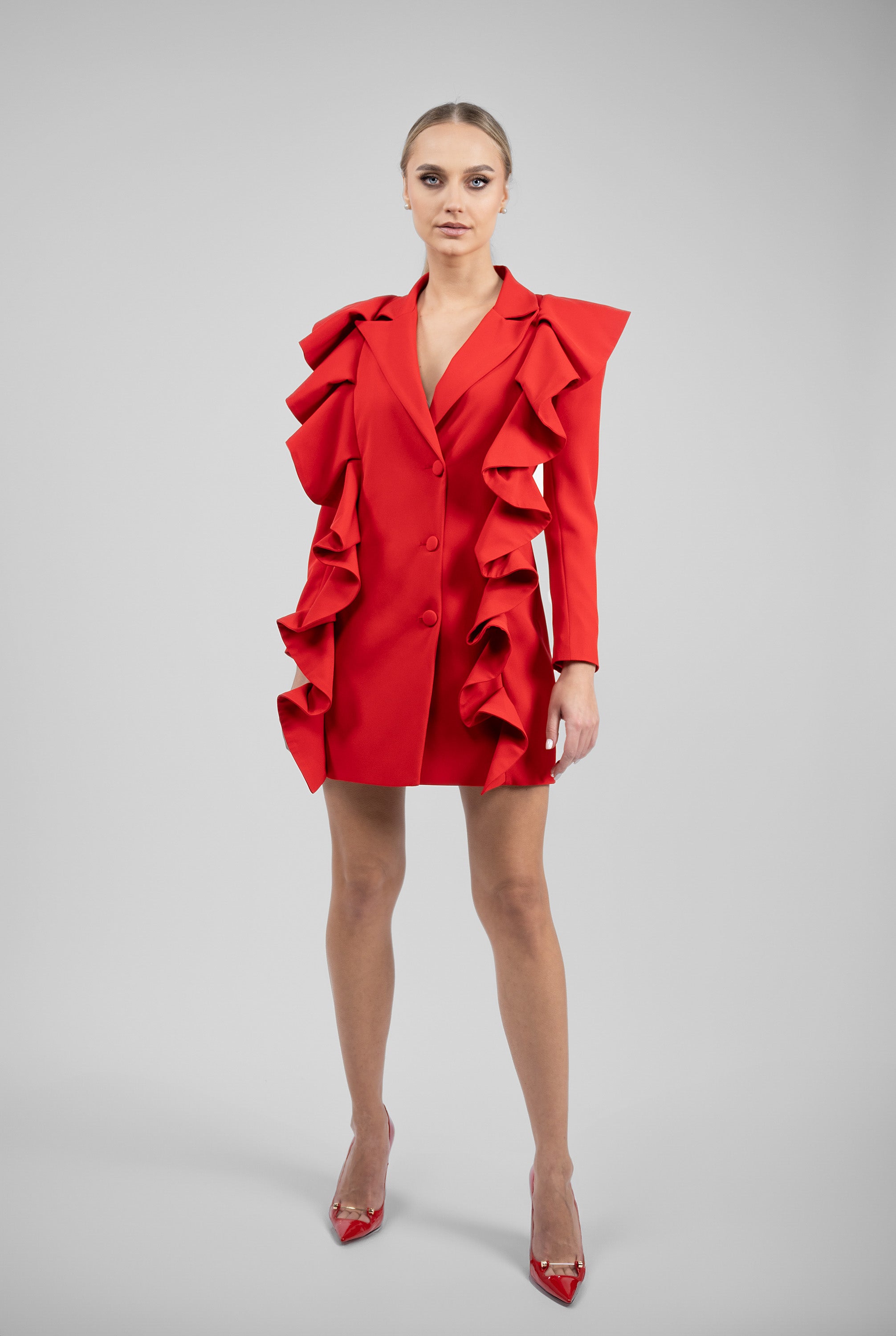 O piesa-statement care cucereste instant privirile, aceasta rochie-sacou imbina perfect eleganta clasica cu un aer teatral, sofisticat. Realizata din stofa structurata, are o croiala ce urmareste linia corpului si este decorata cu volane sculpturale ce pornesc din umeri si coboara armonios pe lateral, conferindu-i volum si miscare. Sistemul de inchidere cu nasturi imbracati si reverele clasice de sacou adauga un plus de rafinament.