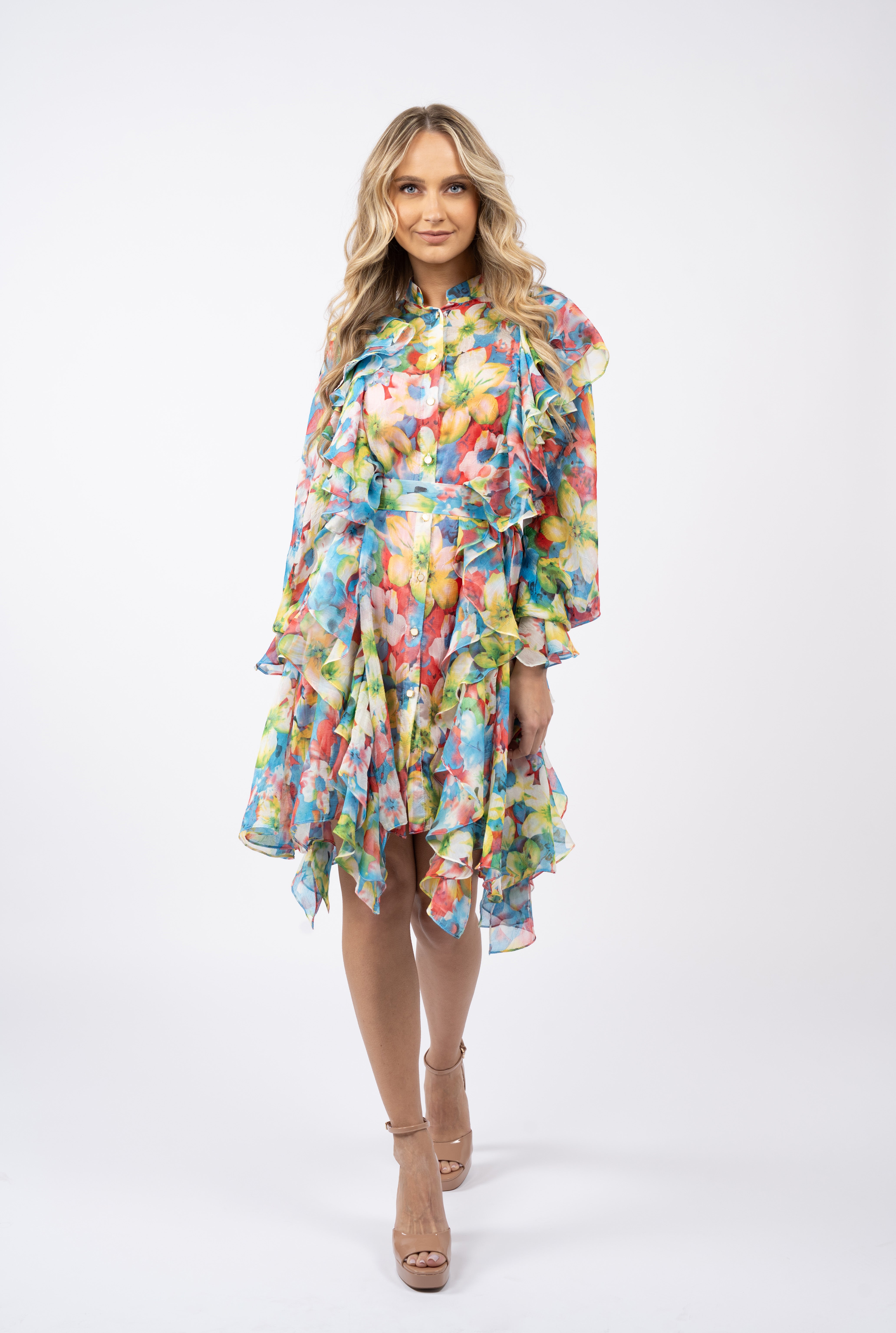 Rochia scurta cu imprimeu floral cucereste prin energia vibranta a culorilor si fluiditatea croielii. Volanele bogate, dispuse pe maneci si pe linia fustei, creeaza un efect spectaculos de miscare si dau un aer romantic, dar in acelasi timp statement. Nasturii decorativi accentueaza linia frontala si adauga un plus de rafinament. Croiala lejera, cu lungime asimetrica, transforma rochia intr-o alegere versatila si feminina, ideala pentru zilele in care vrei sa emani prospetime si stil.