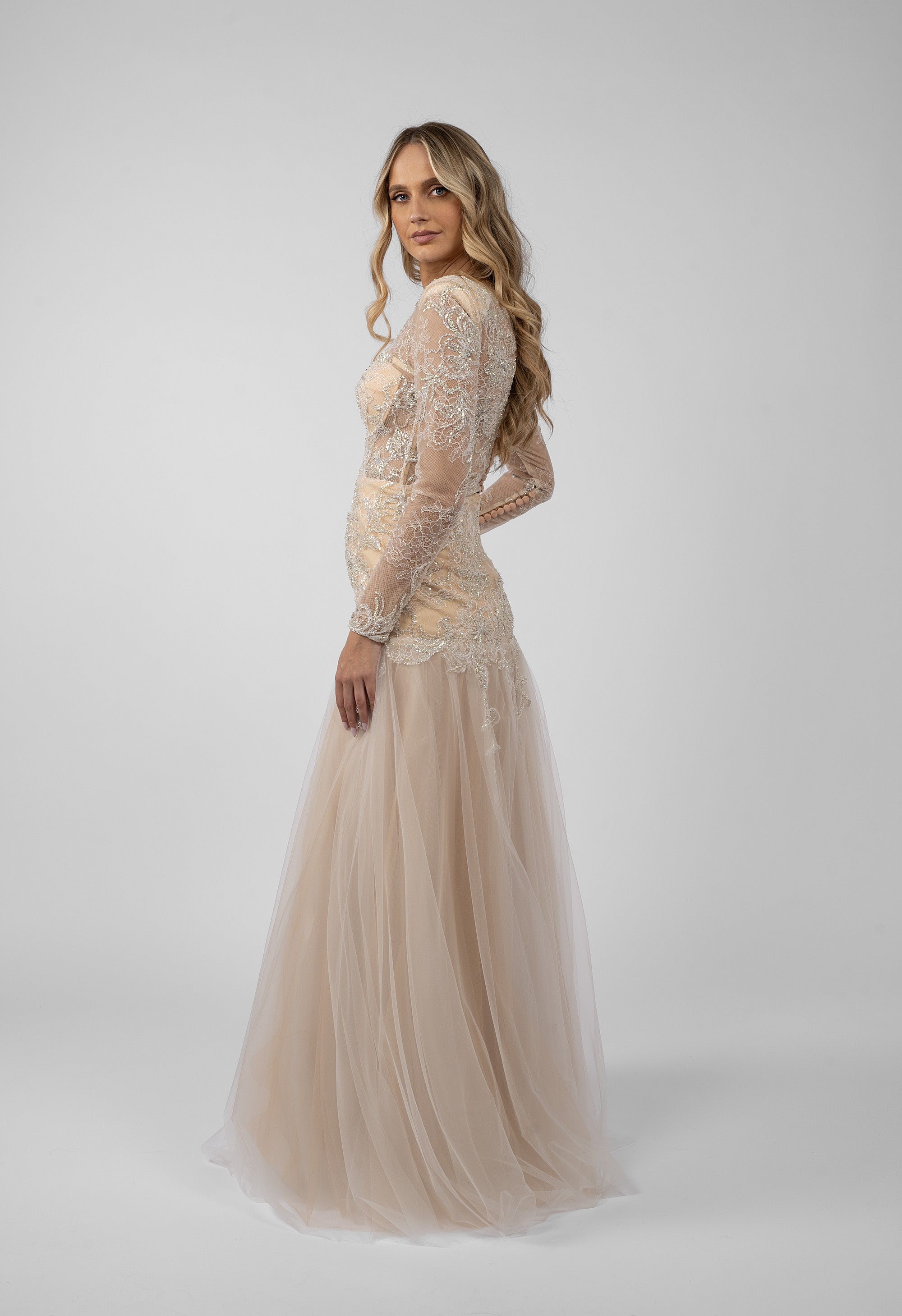 O rochie cu rafinament absolut, definită de transparențe elegante și broderie prețioasă. Baza nude evidențiază dantela chantilly accesorizată cu aplicații strălucitoare, creând un contrast subtil și sofisticat. Croiala sirena urmărește delicat linia corpului, în timp ce partea inferioară din tulle amplu conferă volum și fluiditate. Mânecile lungi și detaliile de nasturi îmbrăcați la manșete adaugă un aer clasic, în timp ce spatele conturat de dantelă brodată păstrează nota de feminitate atemporală.