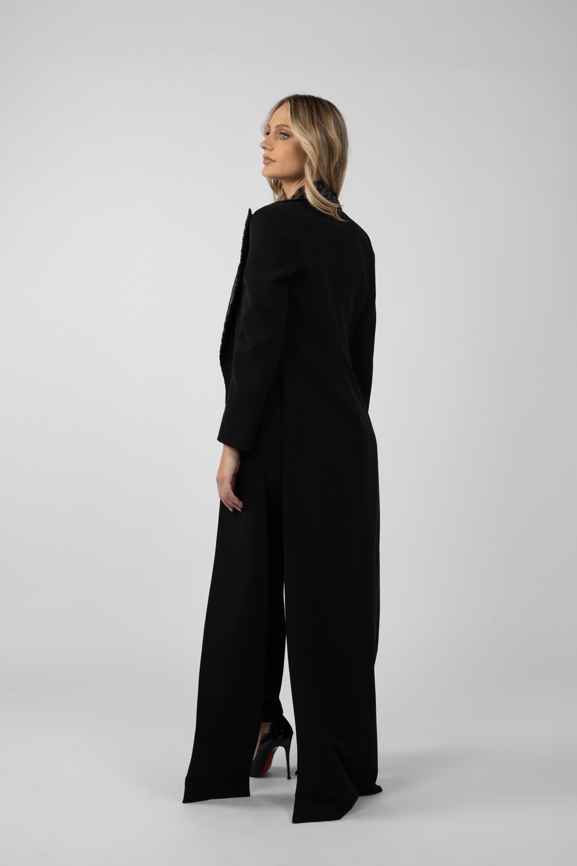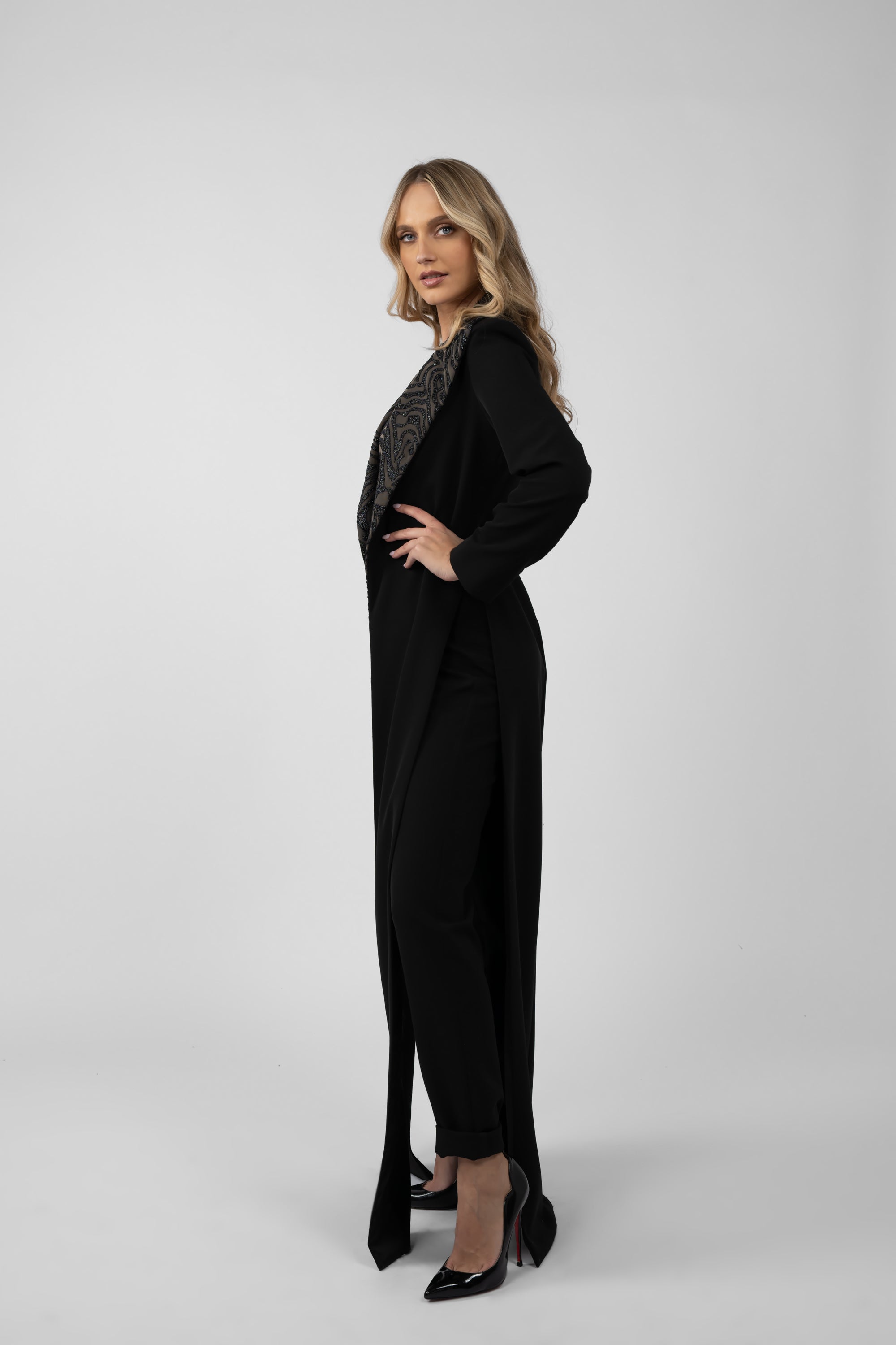 Sacoul lung negru se remarcă prin designul său rafinat, cu linii alungite și croială fluidă. Reverul amplu este decorat cu broderie discretă, adăugând un accent sofisticat și elegant. Sliturile laterale lungi creează un efect de alungire a siluetei și oferă un plus de dinamism piesei, menținând totodată aerul modern și versatil.
