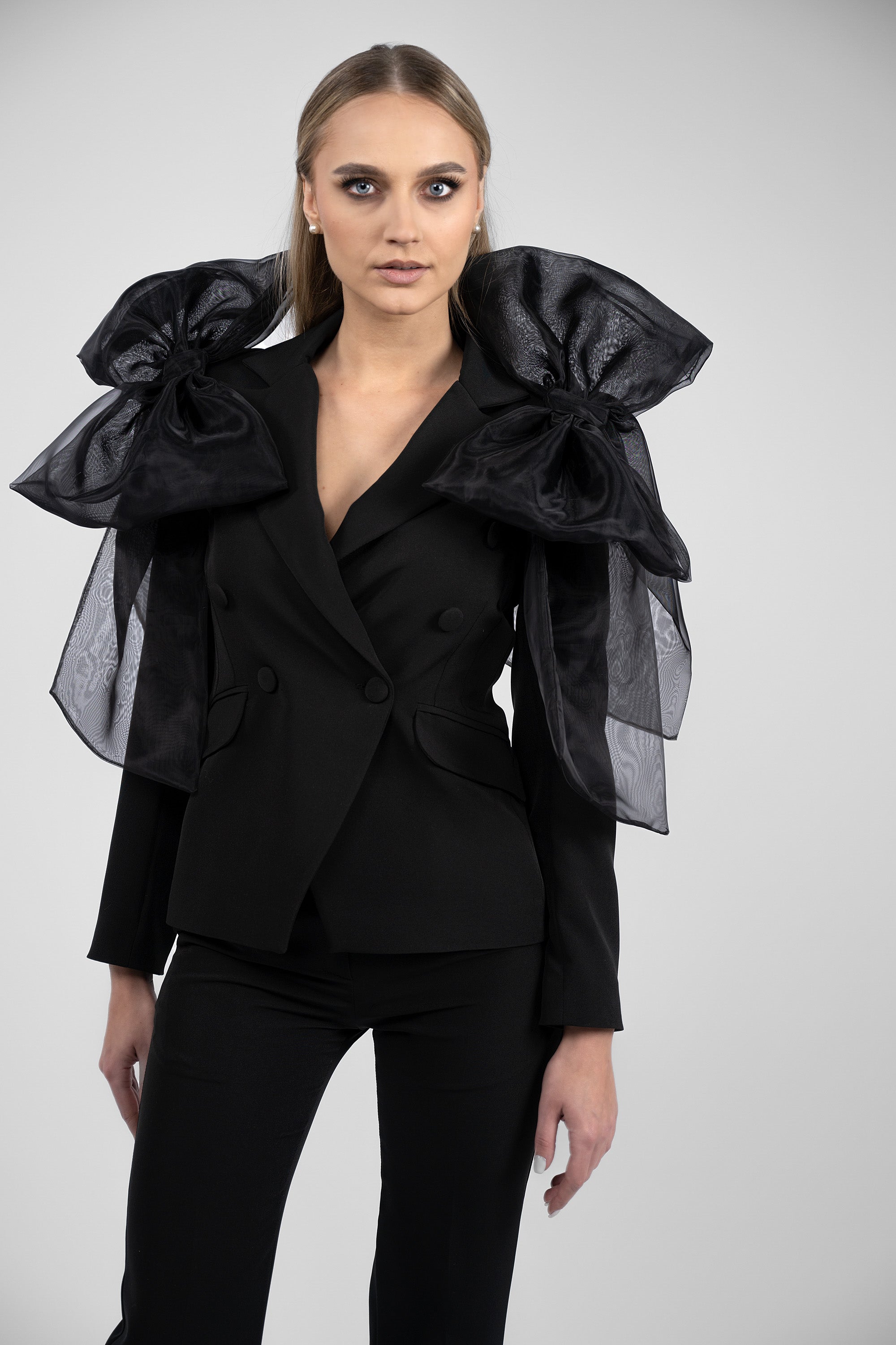 Un sacou spectaculos care redefineste eleganta contemporana printr-un contrast puternic între linii clasice și detalii dramatice. Realizat dintr-o stofa neagra premium, sacoul este accesorizat cu doua funde supradimensionate din organza, aplicate pe umeri, detasabile, ce creeaza un efect sculptural și feminin.