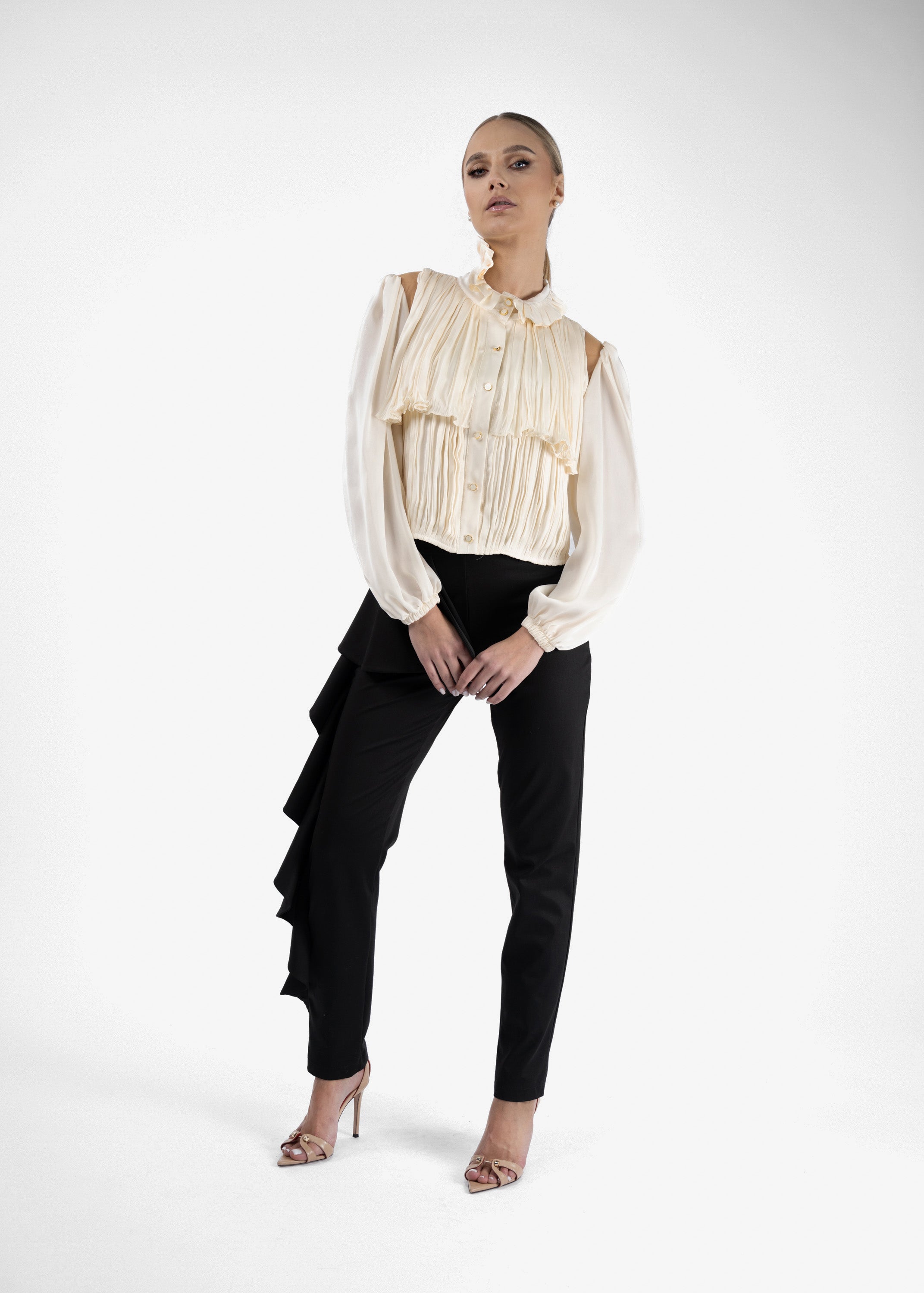 Acest top rafinat este confectionat integral din matase naturala ivoire, cu o textura plisata ce adauga volum si eleganta. Designul delicat este completat de detalii precum gulerul usor inalt, manecile lungi si transparente si decupajele discrete la umeri. Se inchide in fata cu nasturi imbracati, pastrand o linie fluida si feminina.